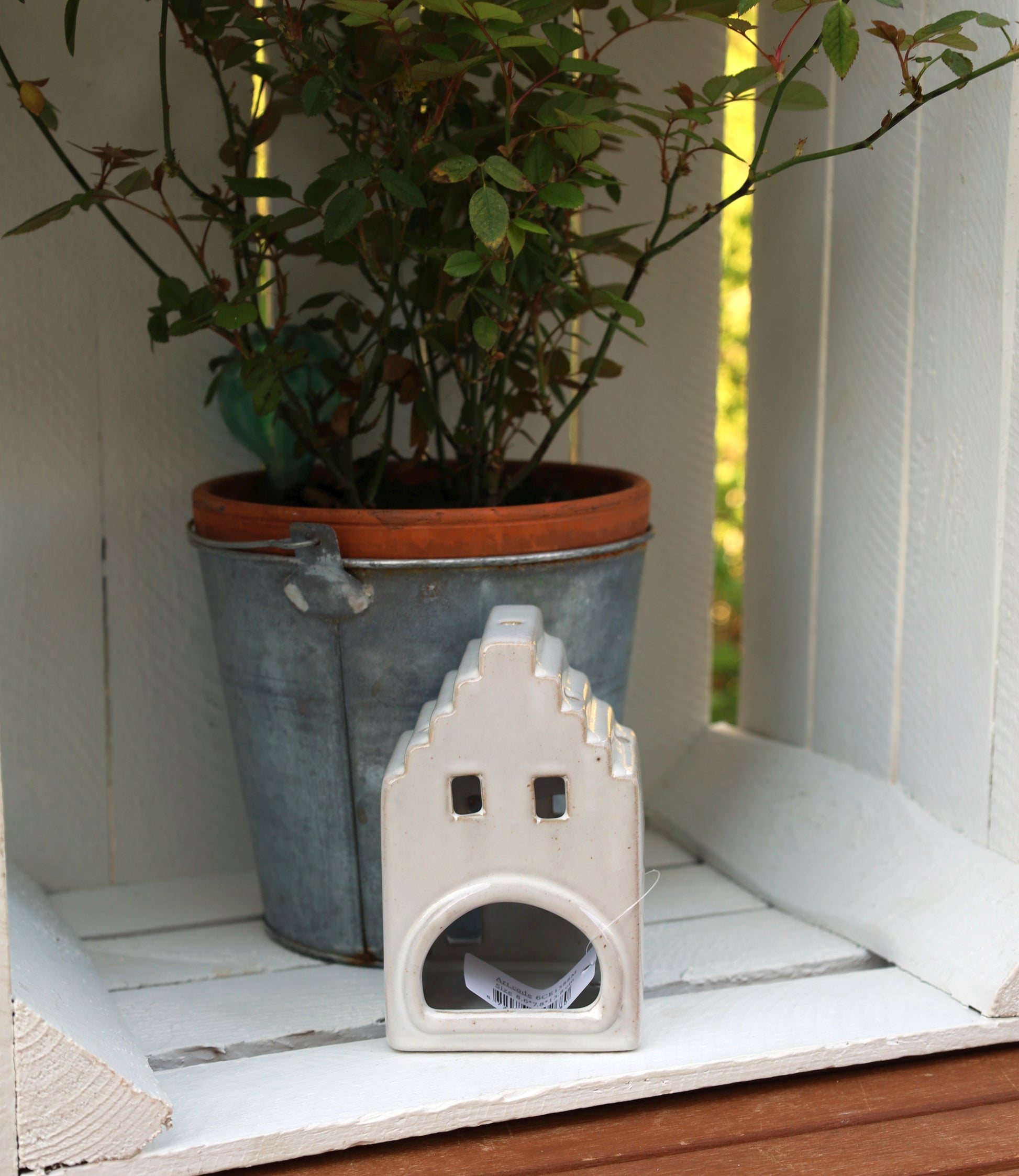 This unique beige porcelain tealight holder in the shape of a little house adds a touch of elegance to any room. The intricate design of the decorative little house makes it a unique and beautiful object.