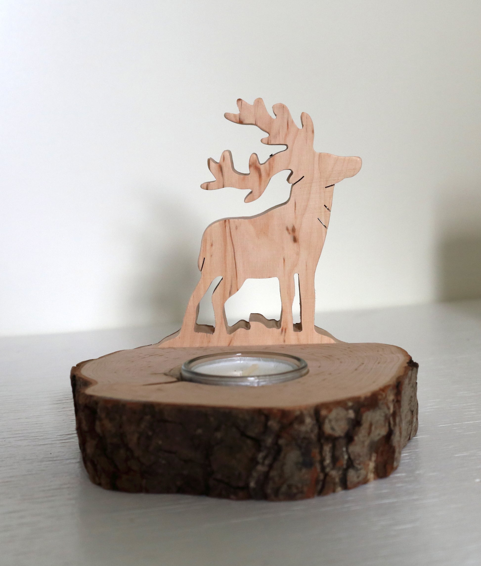 Rustikaler Teelichthalter Baumstamm mit Hirsch