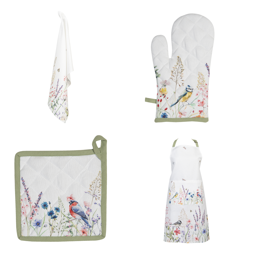 Eine sommerliche Textilserie, die die Natur im Handumdrehen in Ihr Zuhause bringt. Kreieren Sie einen sommerlichen Tisch mit den Tischdecken, die mit Illustrationen von Vögeln, Schmetterlingen und Sommerblumen verziert sind. Für die Küche umfasst diese Kollektion Küchentücher, Ofenhandschuhe und Topflappen. Entscheiden Sie sich für Komfort und wählen Sie die passenden Stuhlkissen und Kissenbezüge in demselben fröhlichen Stil. Absolut blumig!