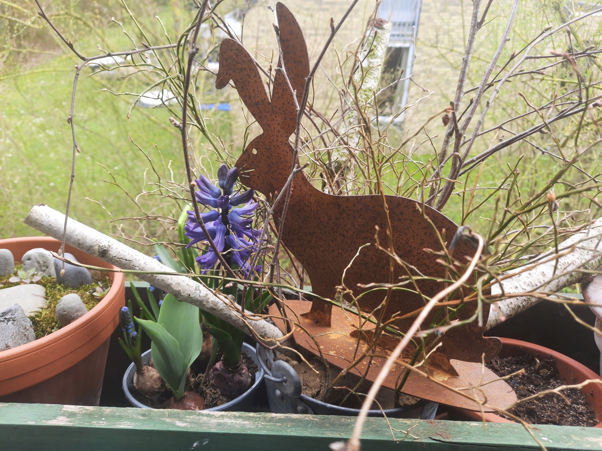 Süße Edelrost Hasen aus Metall, nicht nur hübsch an Ostern, sondern das ganze Frühjahr ein Blickfang in ihrem Garten oder auf dem Balkon. Natürlich machen es sich die beiden auch gerne in Innenräumen, beispielsweise auf einer Fensterbank gemütlich.