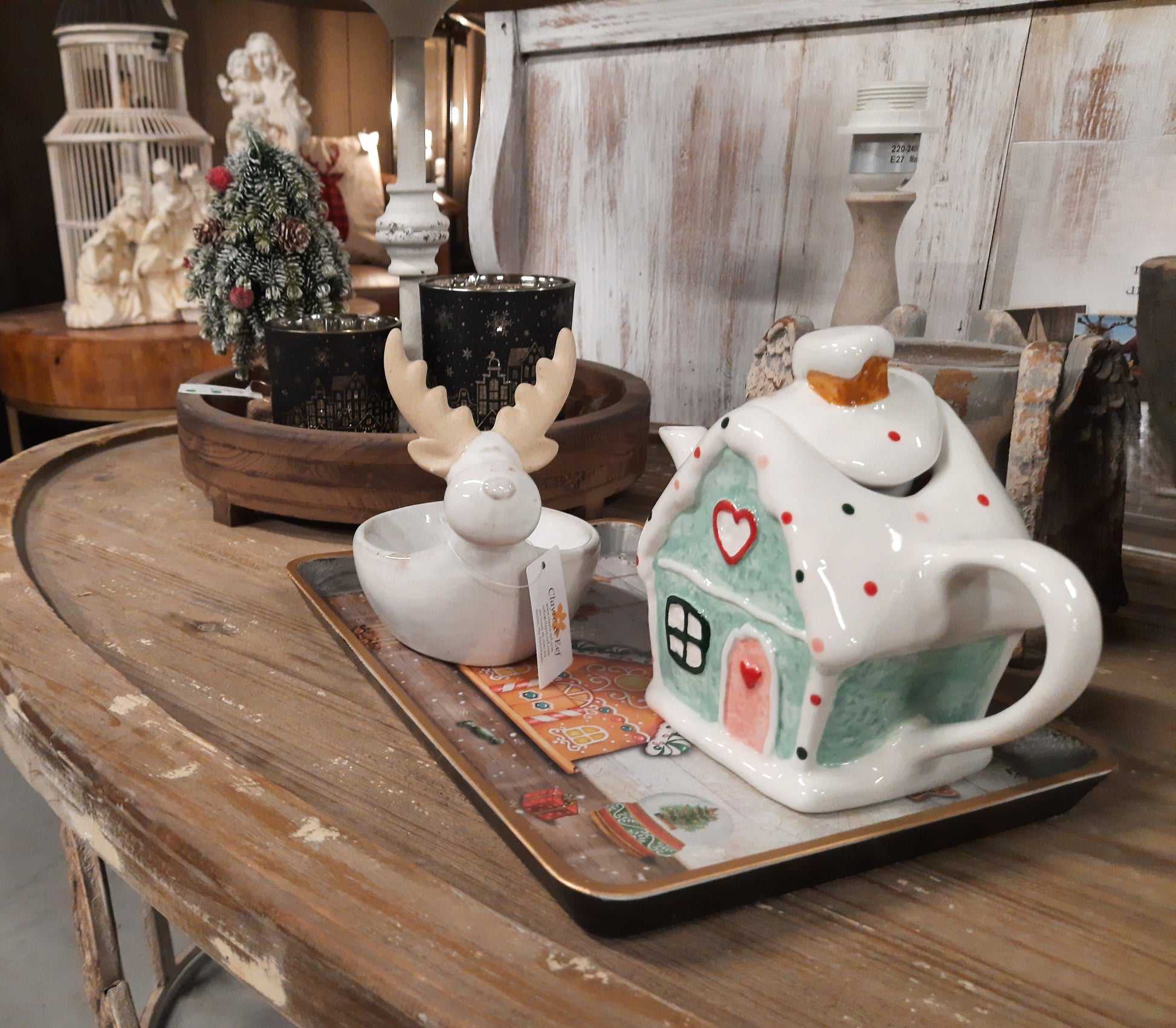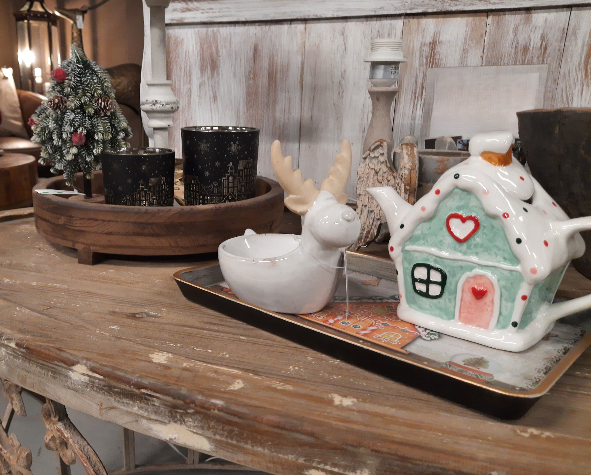 Dekorative hellgraue Schale in Form eines Rentiers. Hergestellt aus Porzellan im ländlichen Stil. Ideal als Weihnachtsdekoration.