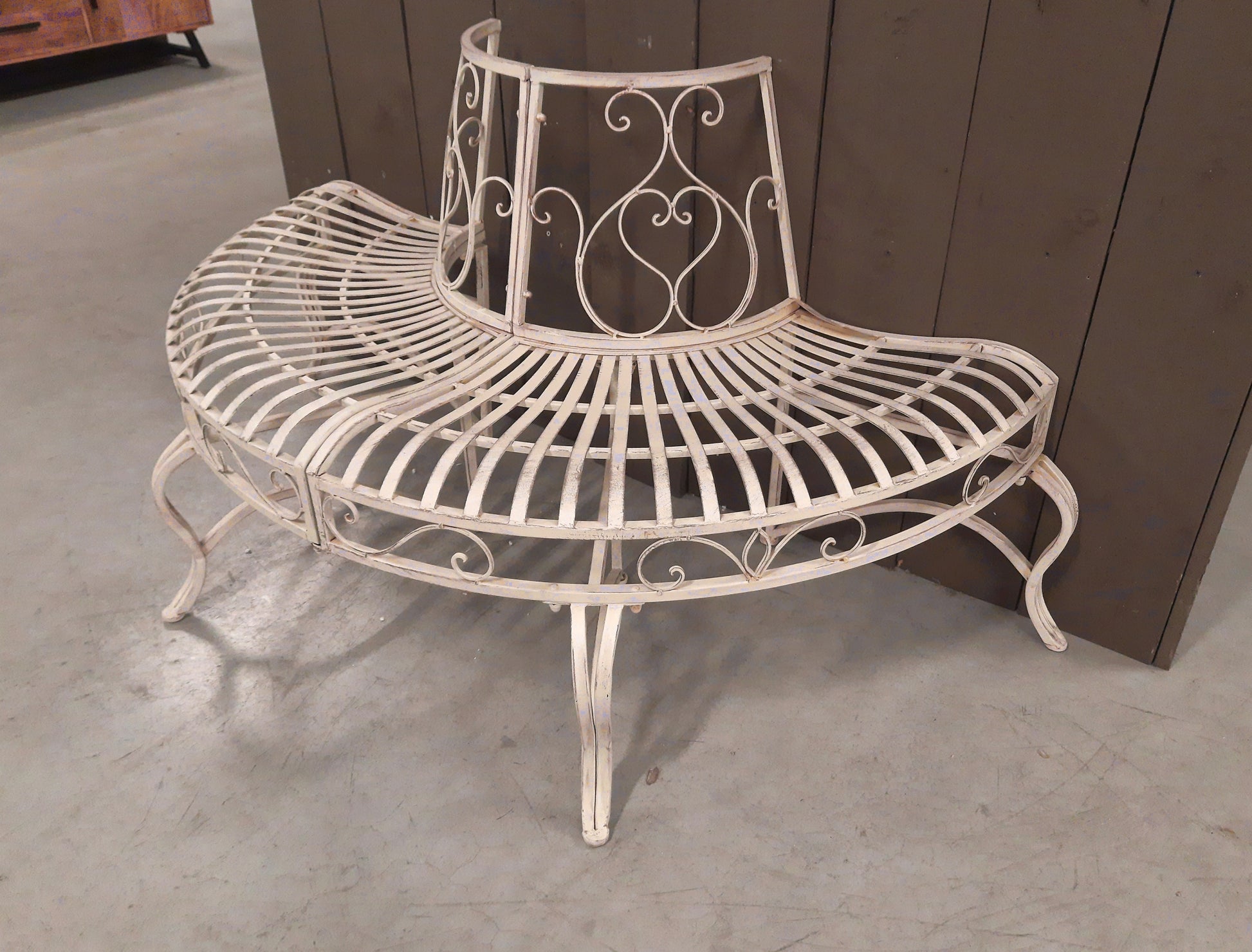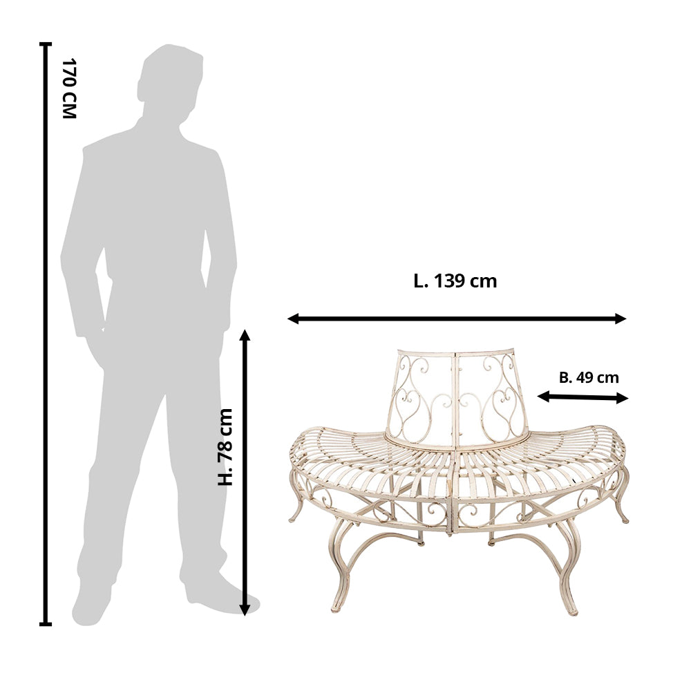 Diese halbrunde Gartenbank im Landhausstil aus robustem Eisen in zartem Antikweiß schafft eine zauberhafte Atmosphäre in Ihrem Garten. Die "Baumbank" umschließt Ihren Lieblingsbaum sanft und lädt zum Verweilen und Träumen ein. Ihr romantisches Design verbindet eleganten Charme mit beständiger Qualität und macht jeden Gartenmoment besonders.