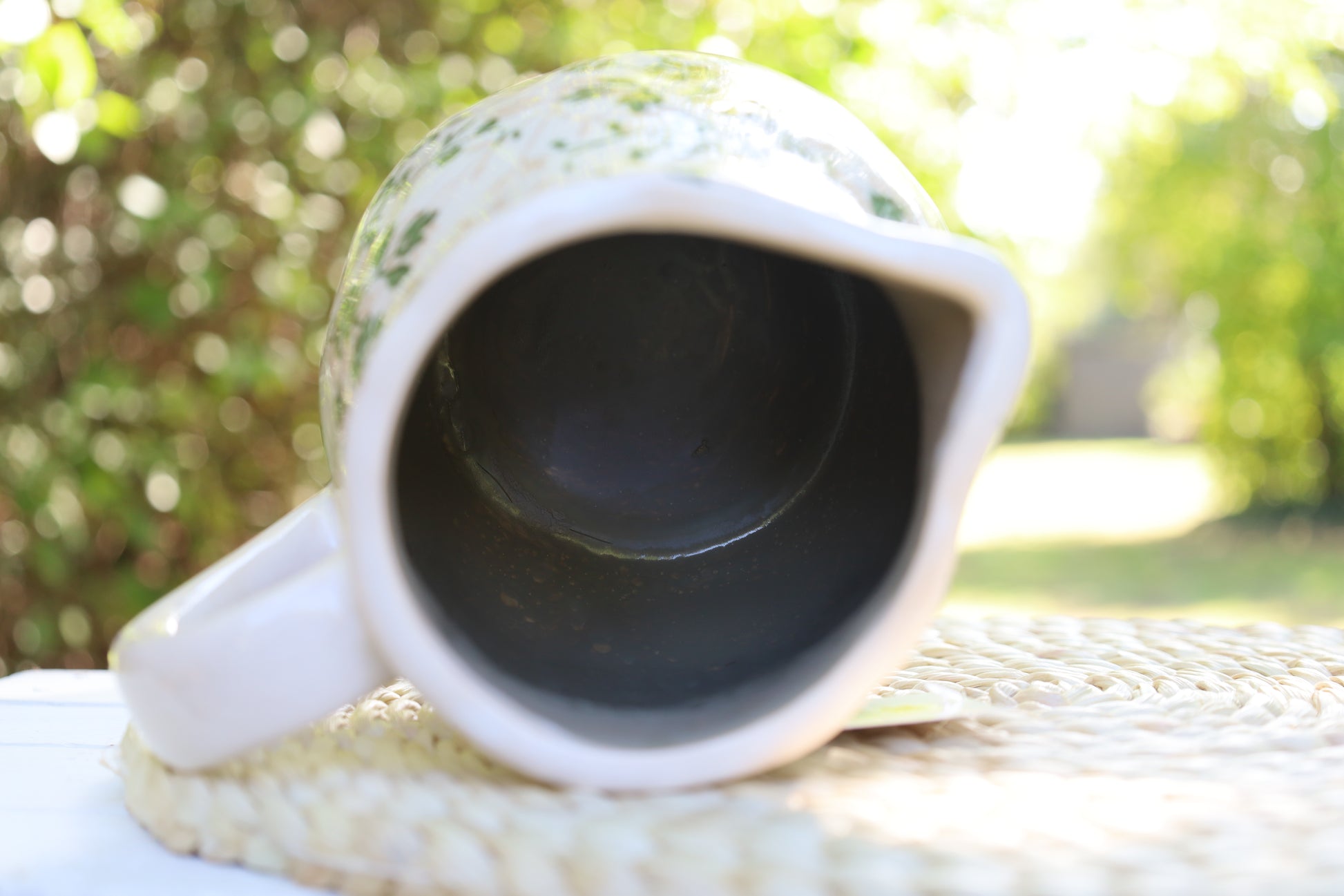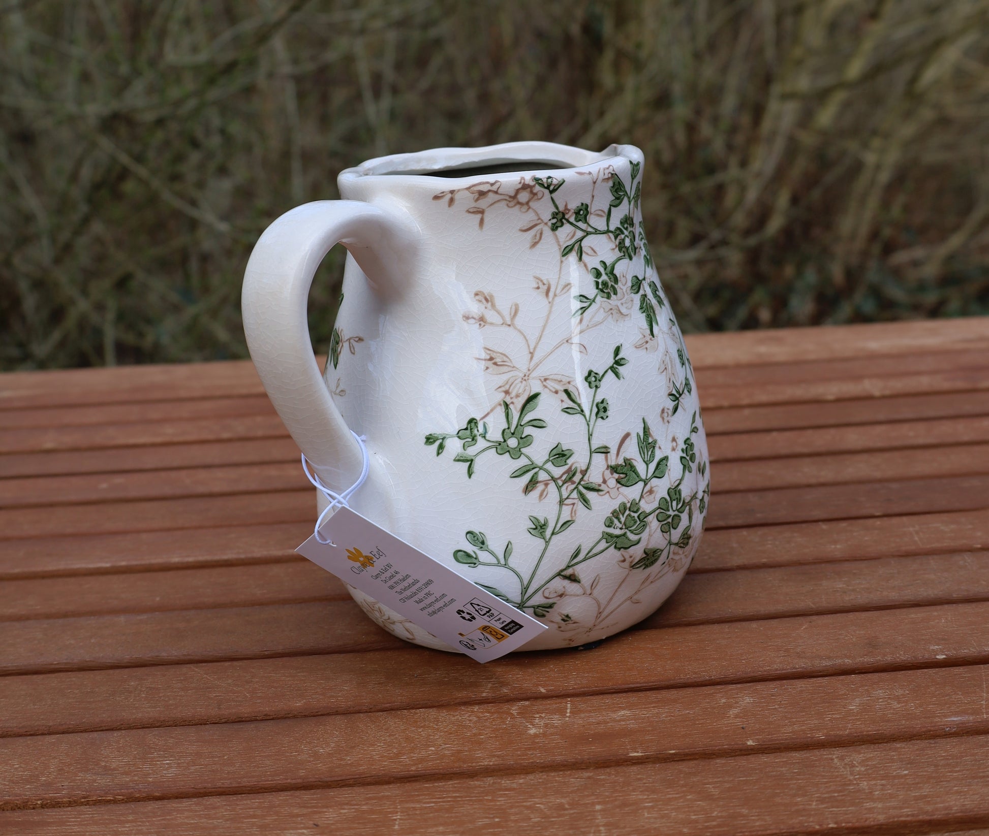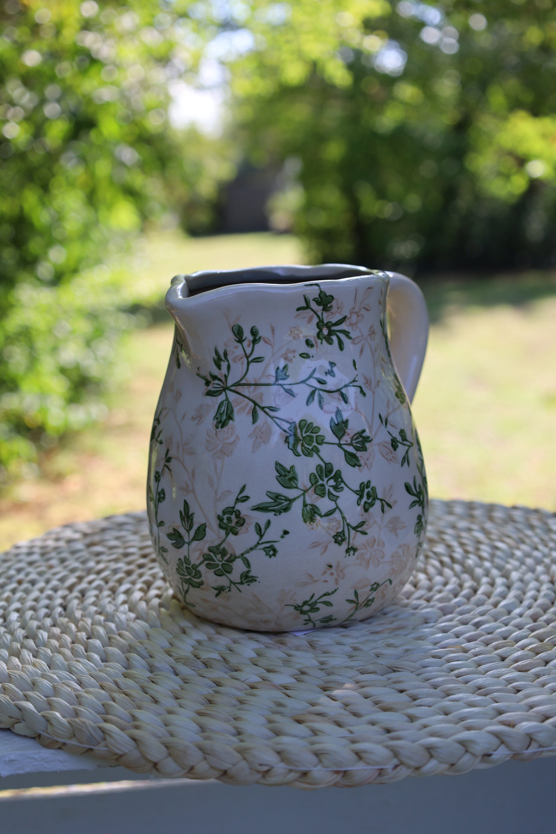 Dieser dekorative Keramikkrug besticht durch sein natürliches Design mit einem sanften beige-farbenen Grundton und einem filigranen grünen Rankenmuster. Er schafft eine warme, einladende Atmosphäre und ist perfekt geeignet, um Ihrem Zuhause eine harmonische, naturnahe Note zu verleihen. Ob als Vase oder dekoratives Einzelstück – dieser Krug verbindet klassischen Charme mit natürlicher Ästhetik.