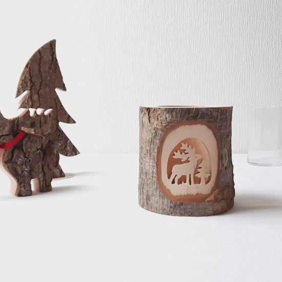 Rustikaler Teelichthalter Baumstamm mit Hirsch & Tannenbaum - Handgefertigt