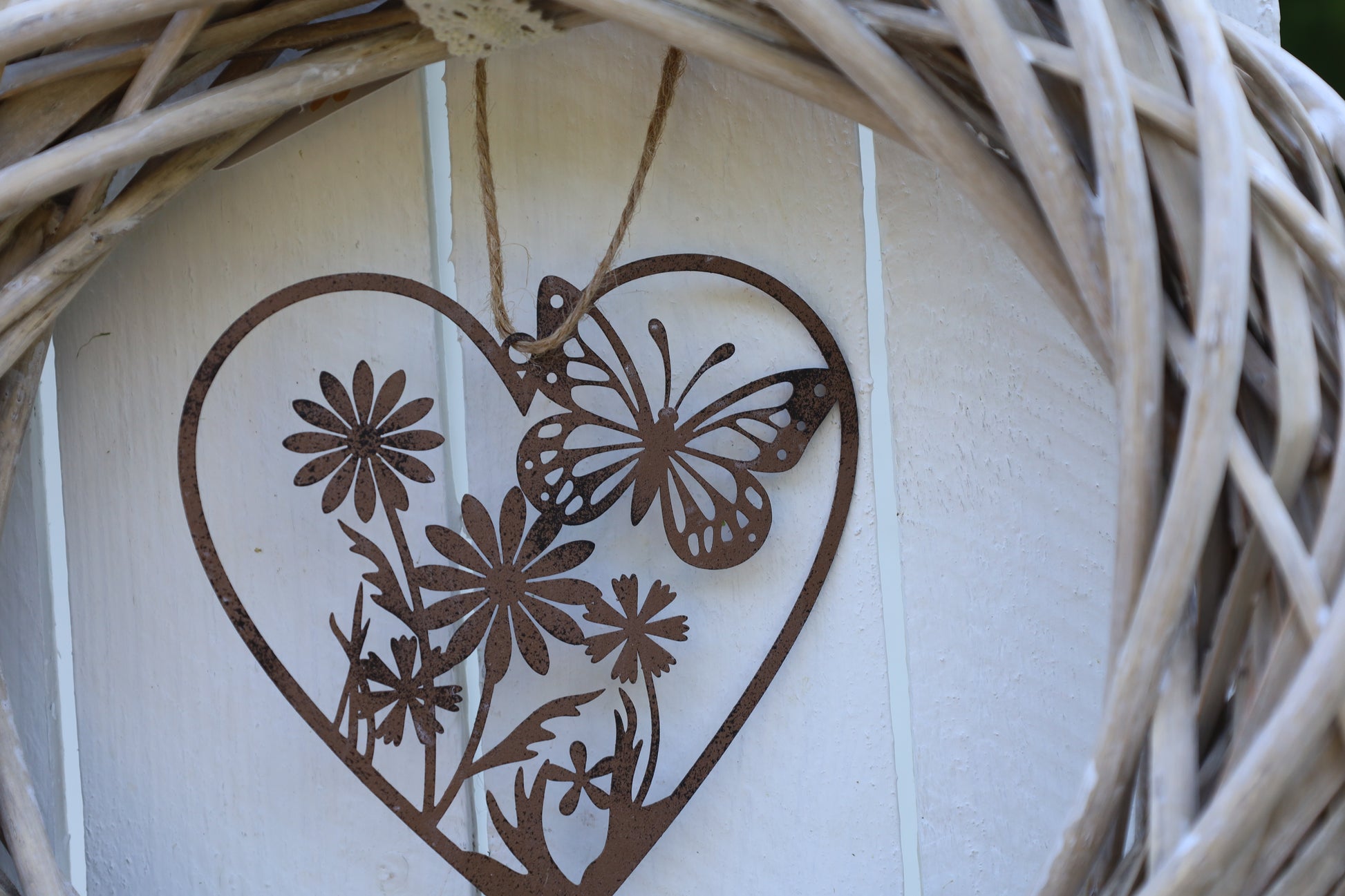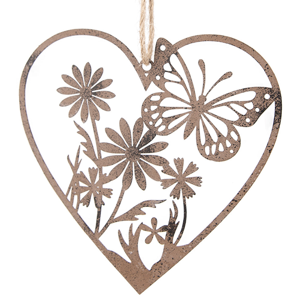 Ein schöner dekorativer Anhänger in Form eines Herzens, mit Blumen und Schmetterling. Hergestellt aus Metall, in der braunen Farbe, ist es eine langlebige Dekoration, die sich leicht an jedem Ort aufhängen lässt.