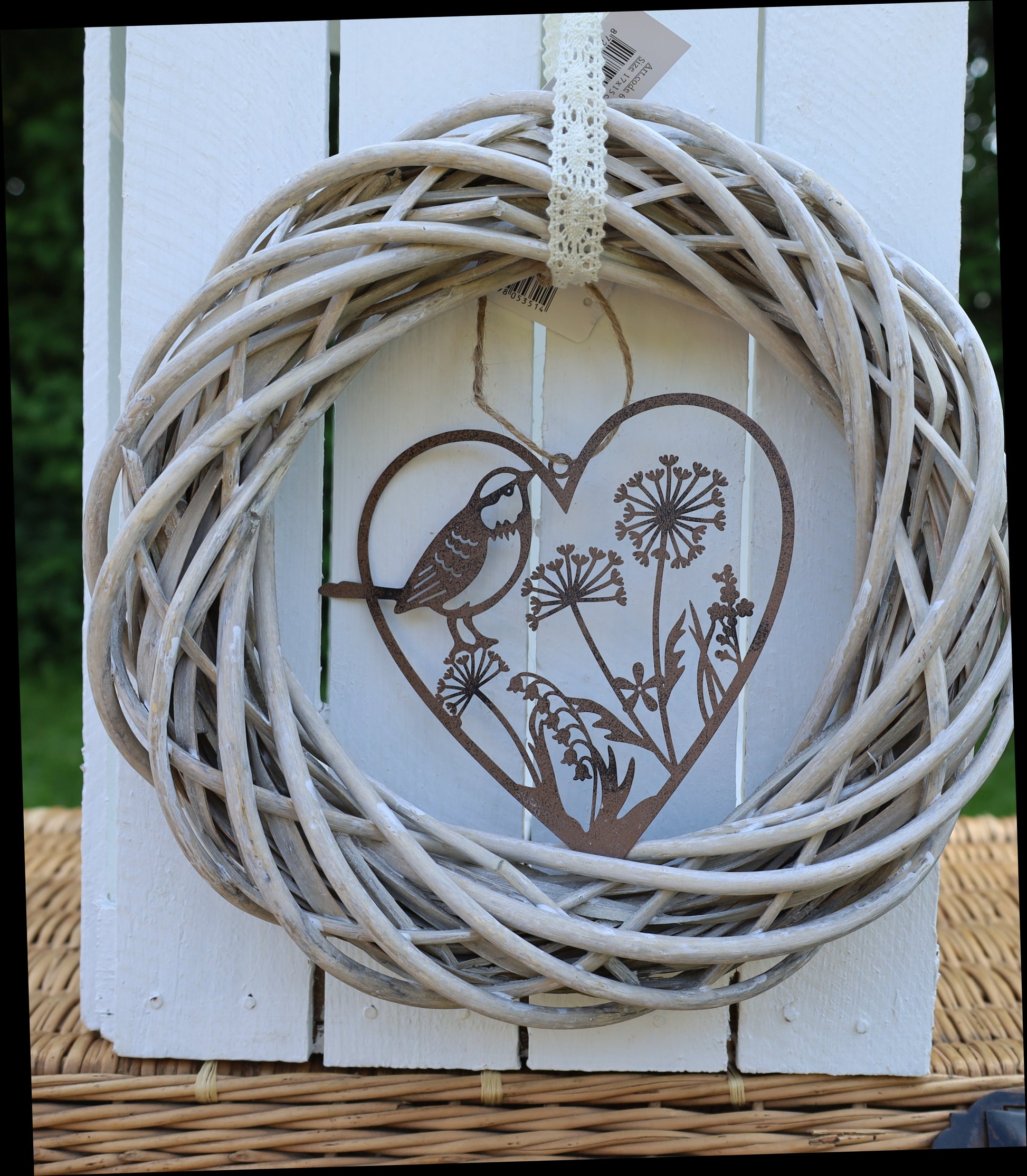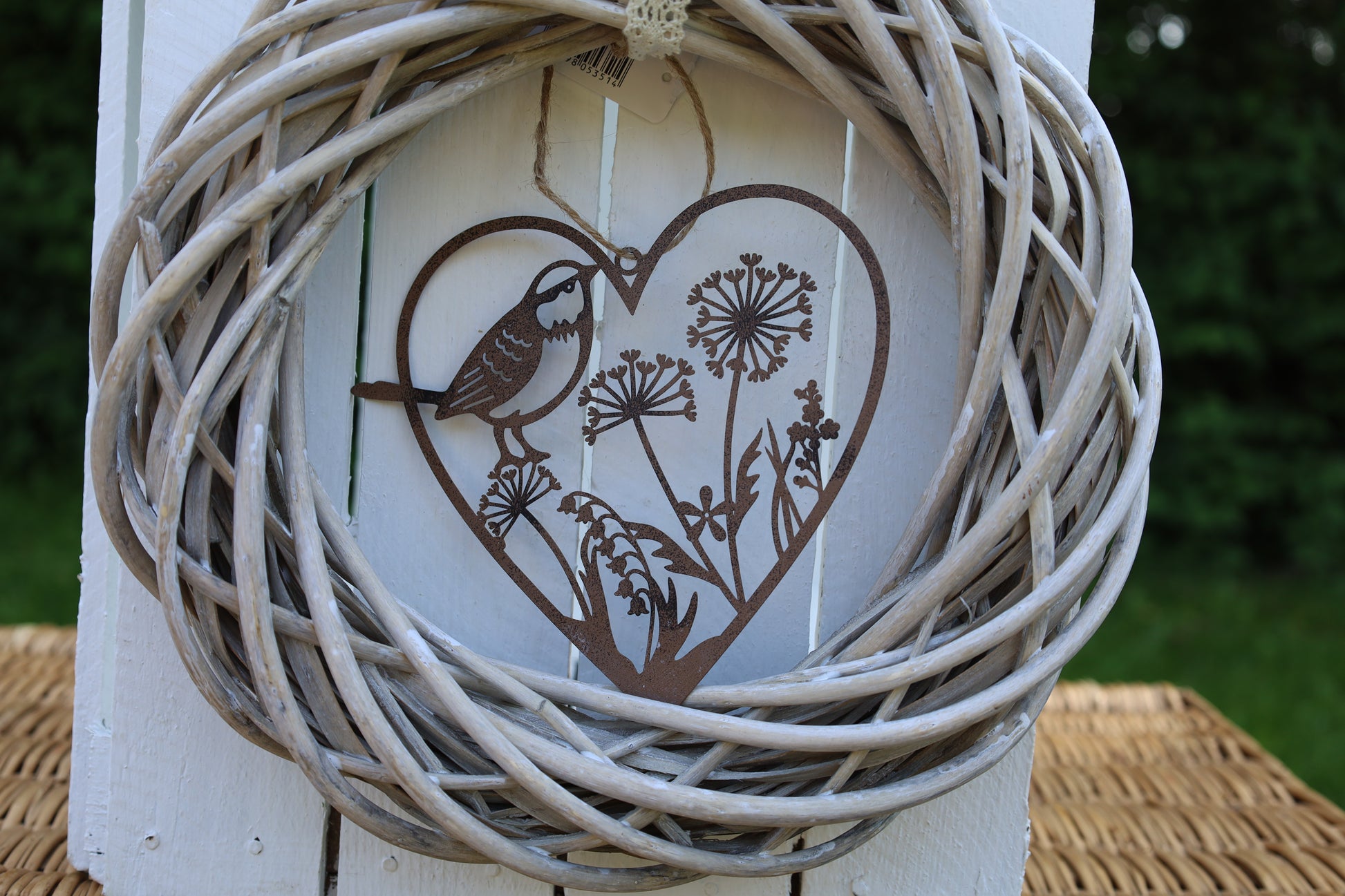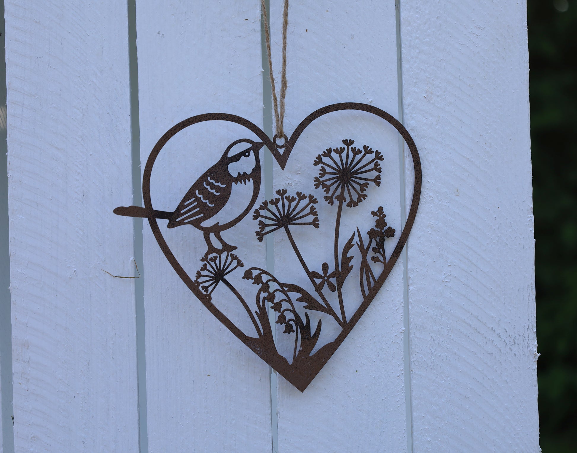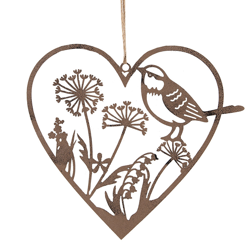 Ein schöner dekorativer Anhänger in Form eines Herzens, mit Blumen und Vogel. Hergestellt aus Metall, in der braunen Farbe, ist es eine langlebige Dekoration, die sich leicht an jedem Ort aufhängen lässt.