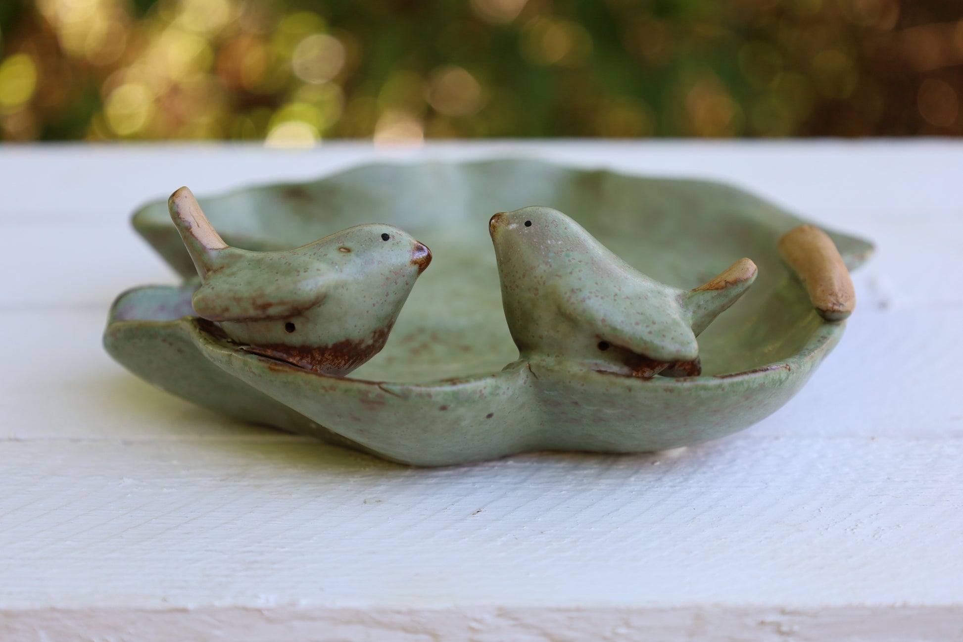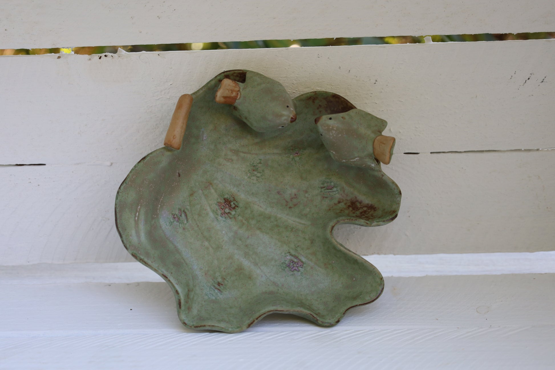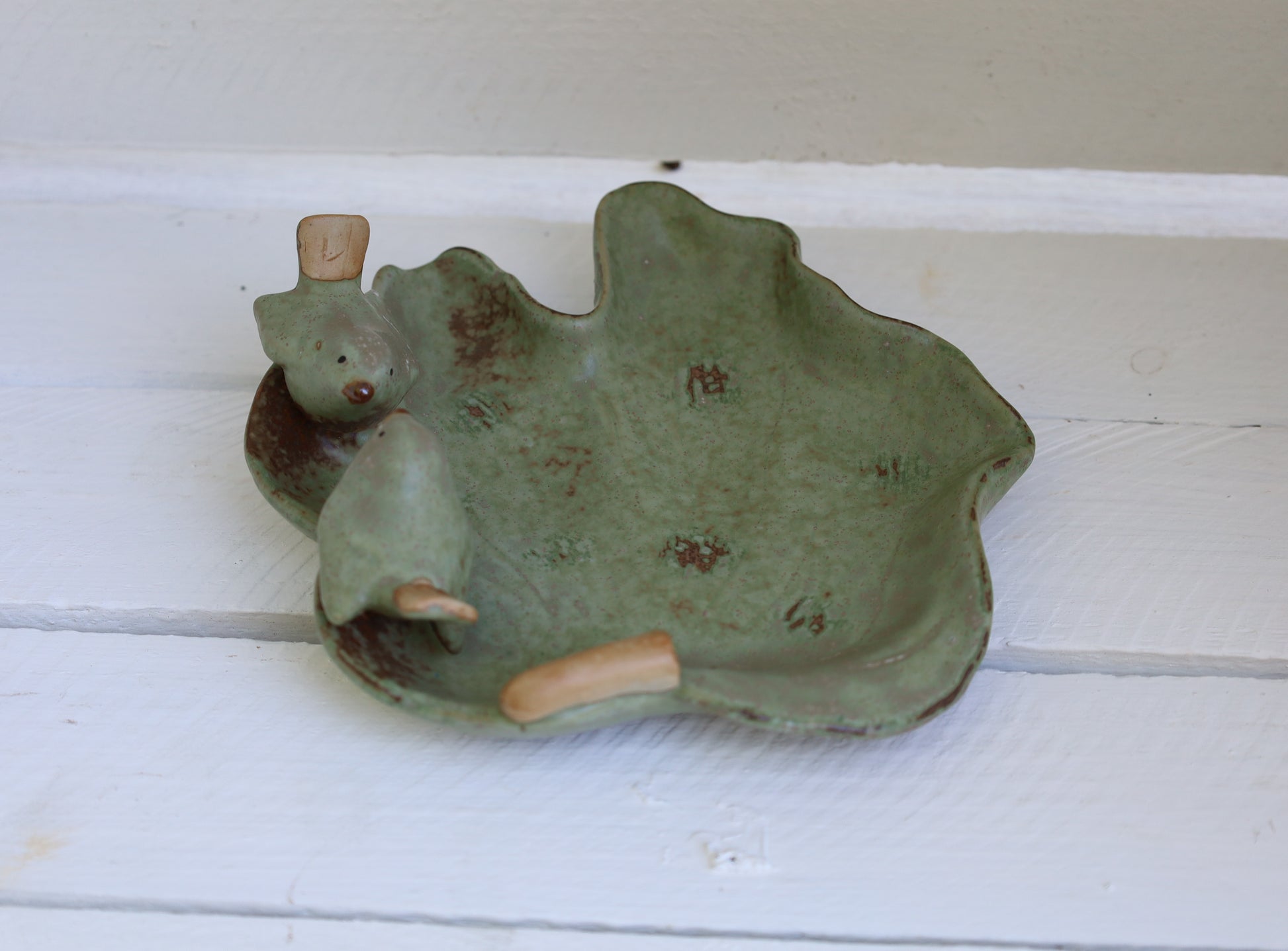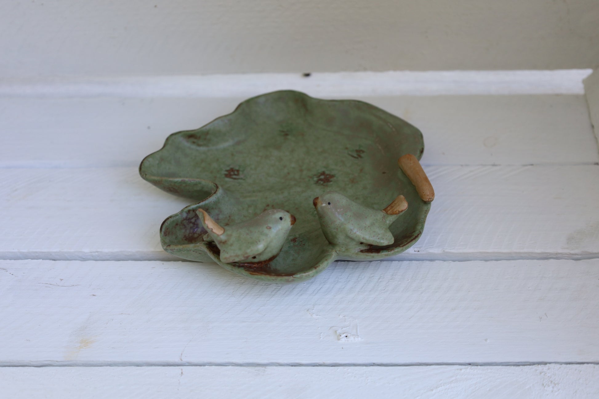 Diese Keramikschale in Blattform mit zarten Vogelmotiven in Grün bringt einen warmen, herbstlichen Charme in Ihr Zuhause. Perfekt als Dekoration oder für kleine Schätze, schafft sie eine gemütliche Atmosphäre und verbindet Natur und Kunst auf sanfte Weise.