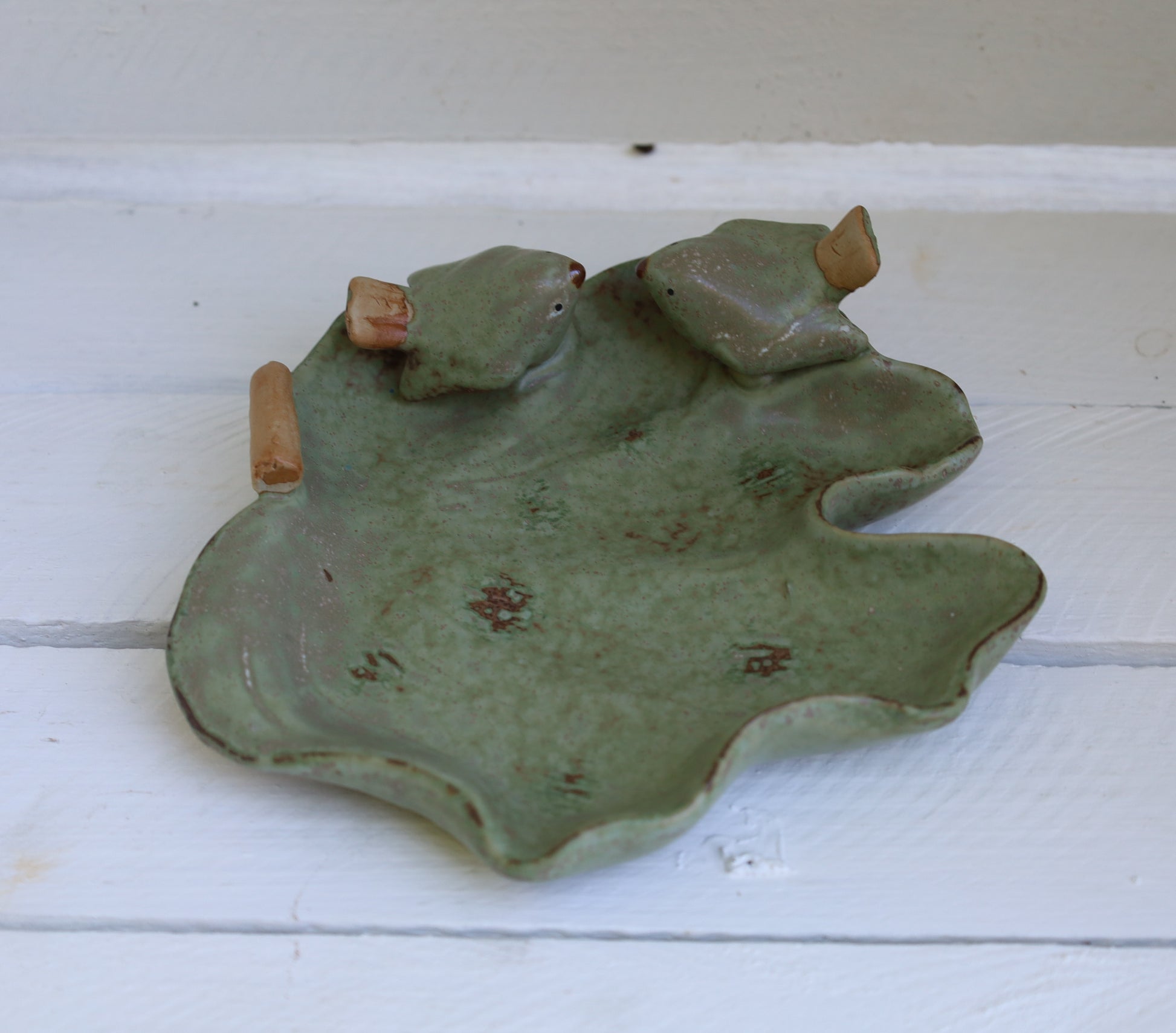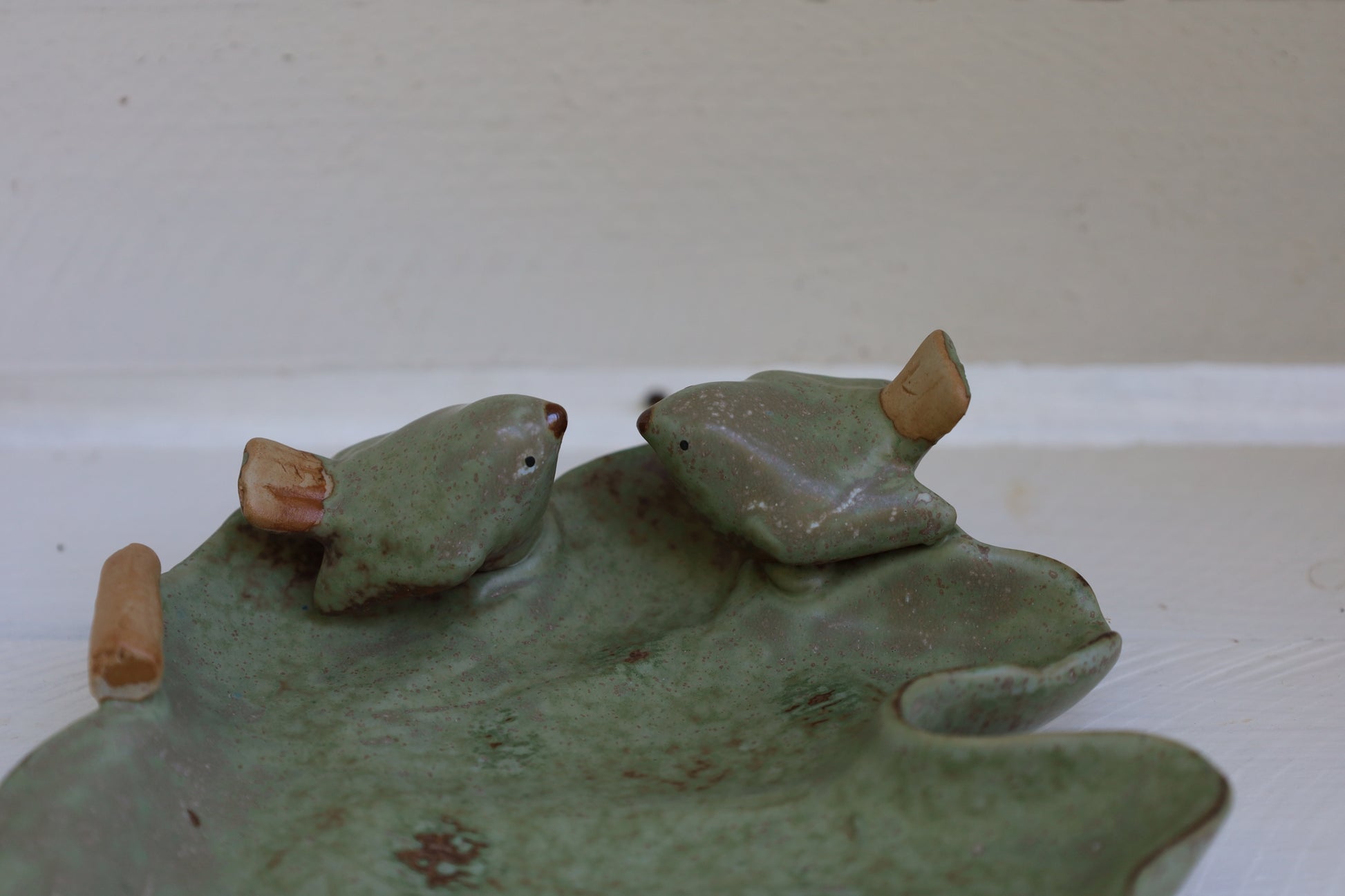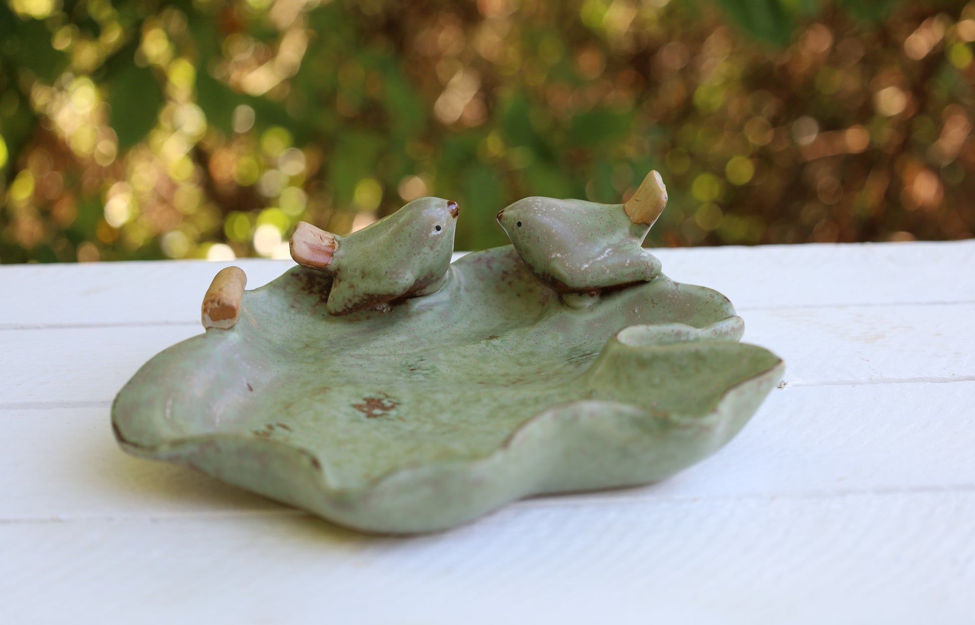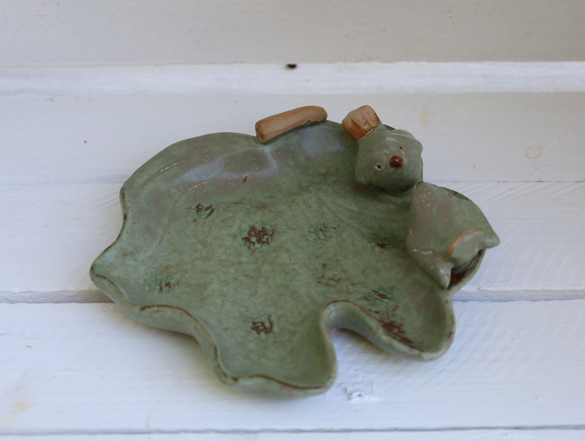 Diese Keramikschale in Blattform mit zarten Vogelmotiven in Grün bringt einen warmen, herbstlichen Charme in Ihr Zuhause. Perfekt als Dekoration oder für kleine Schätze, schafft sie eine gemütliche Atmosphäre und verbindet Natur und Kunst auf sanfte Weise.