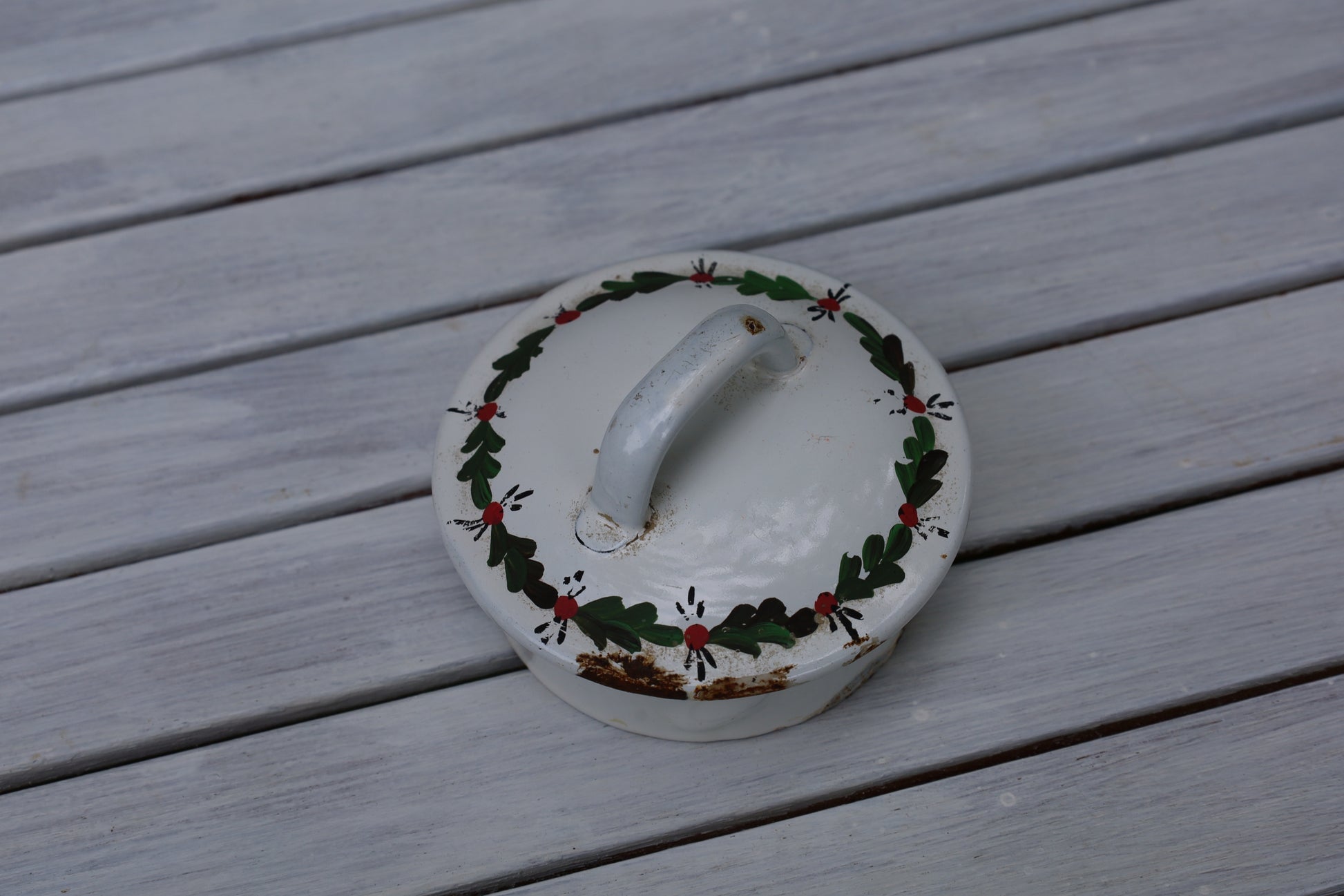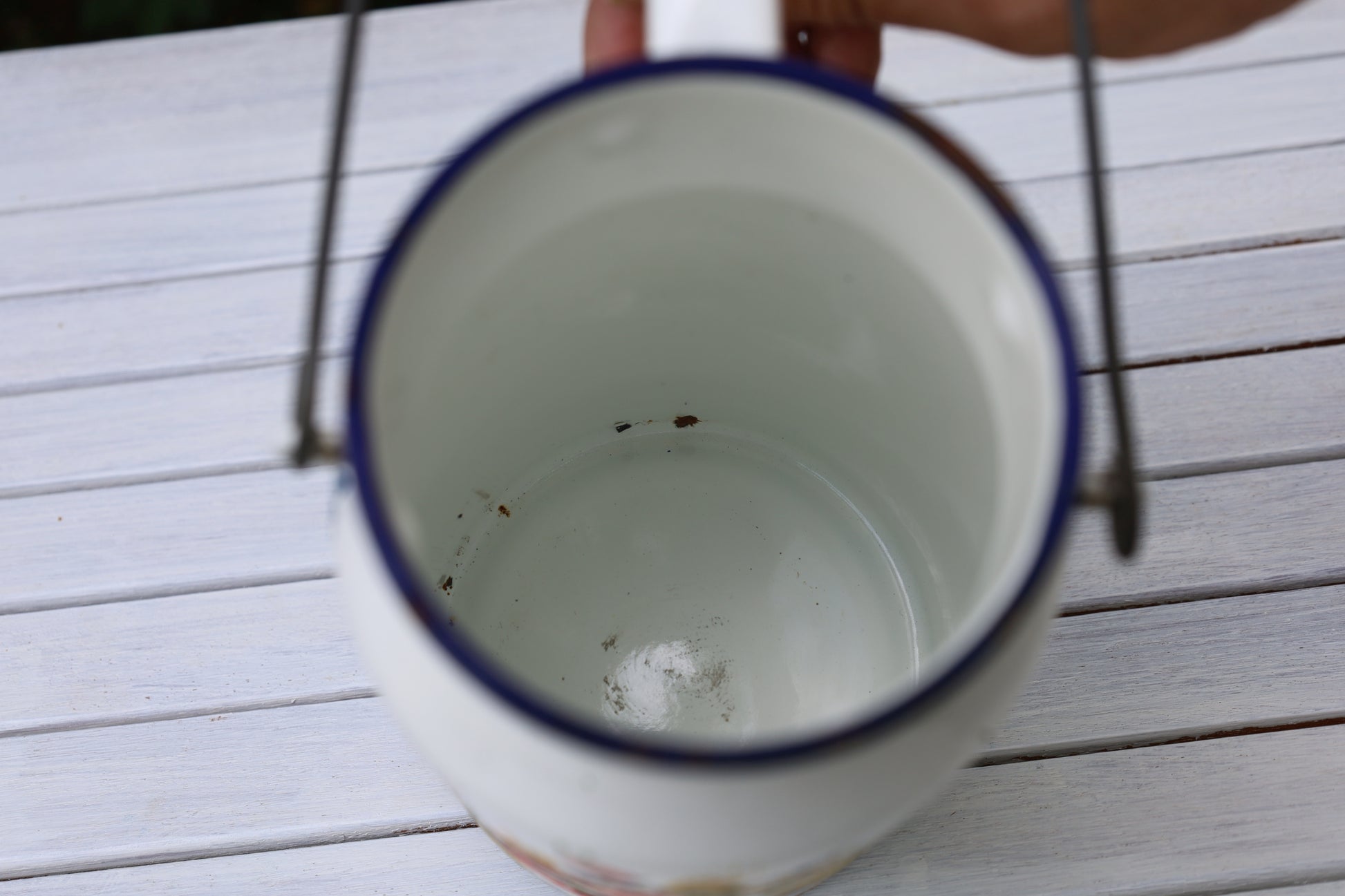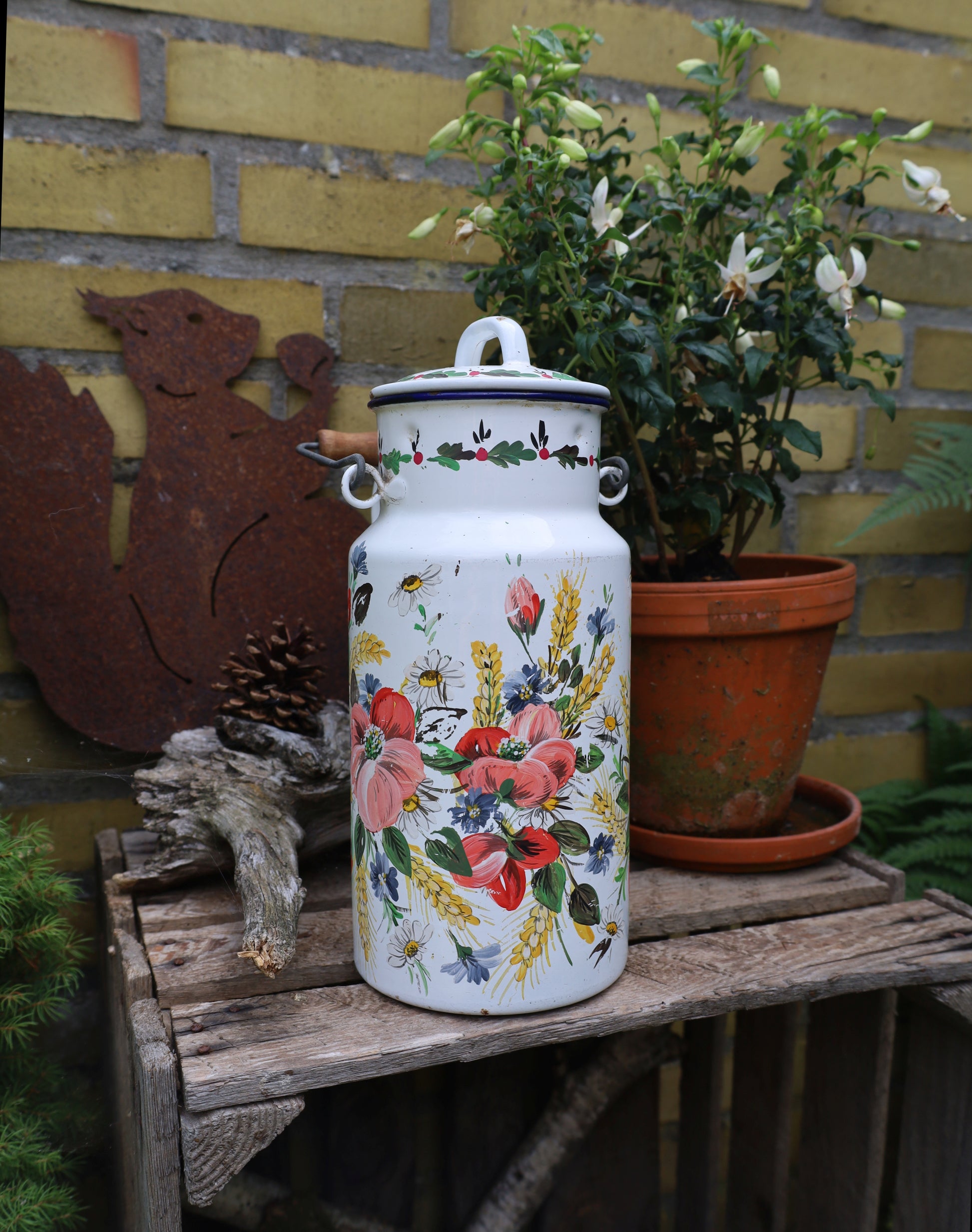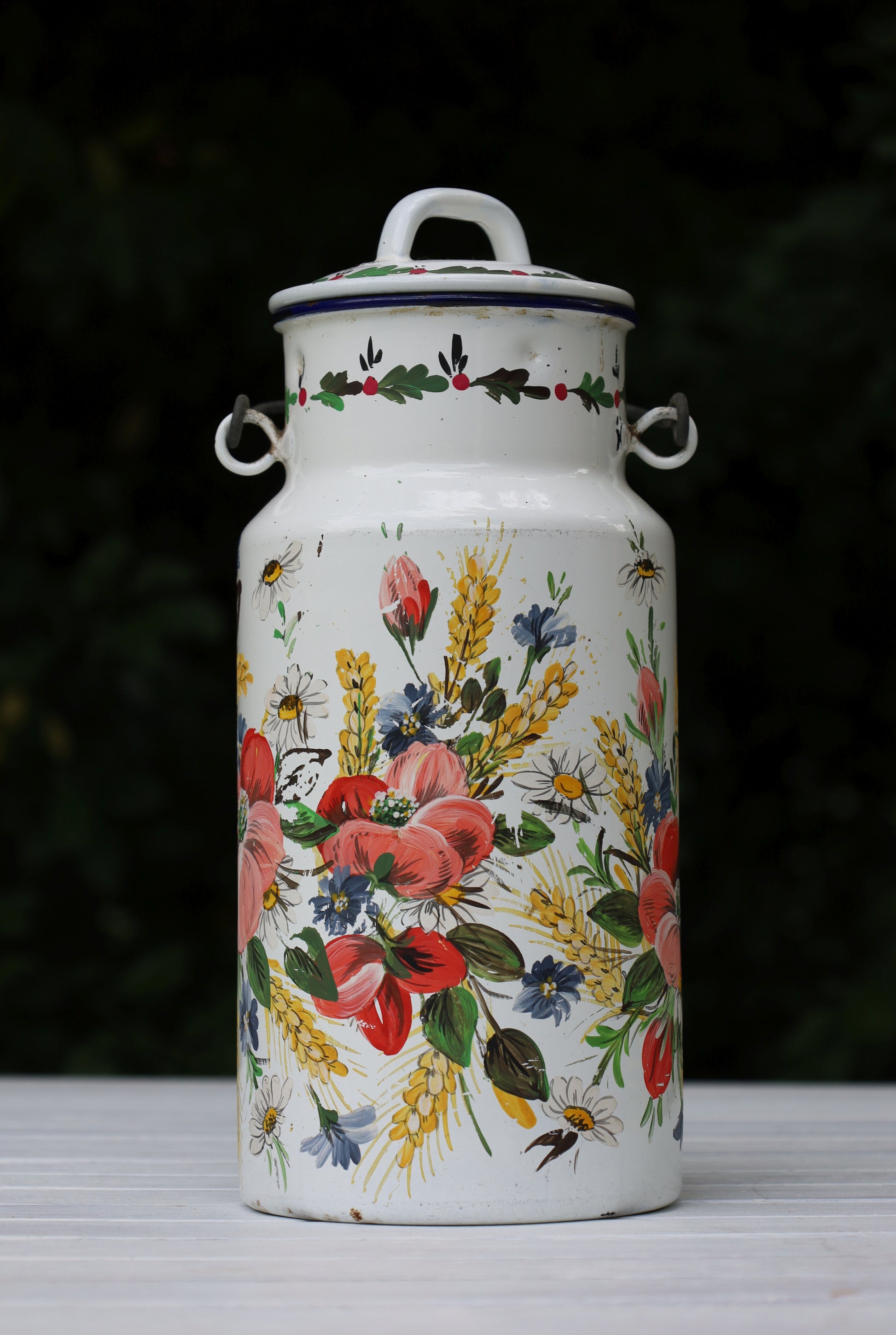 Vintage Emaille-Milchkanne mit Bauernmalerei
