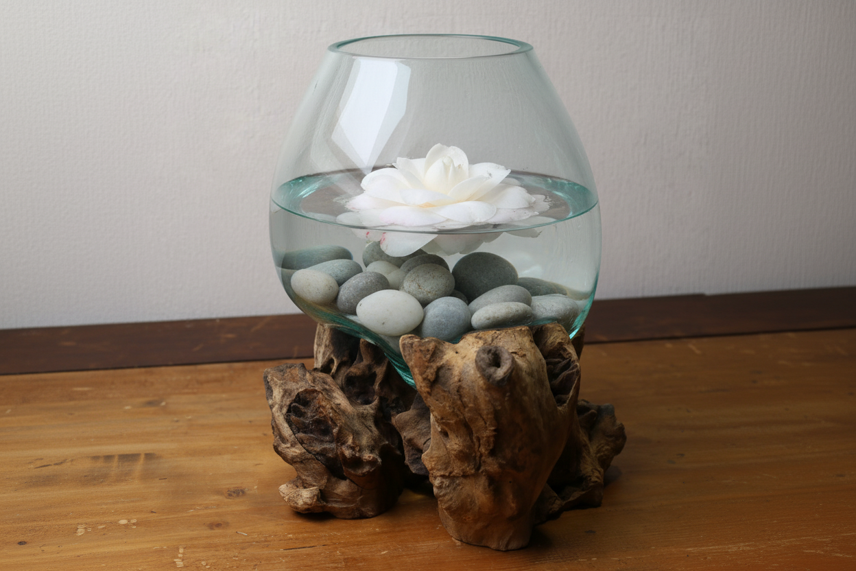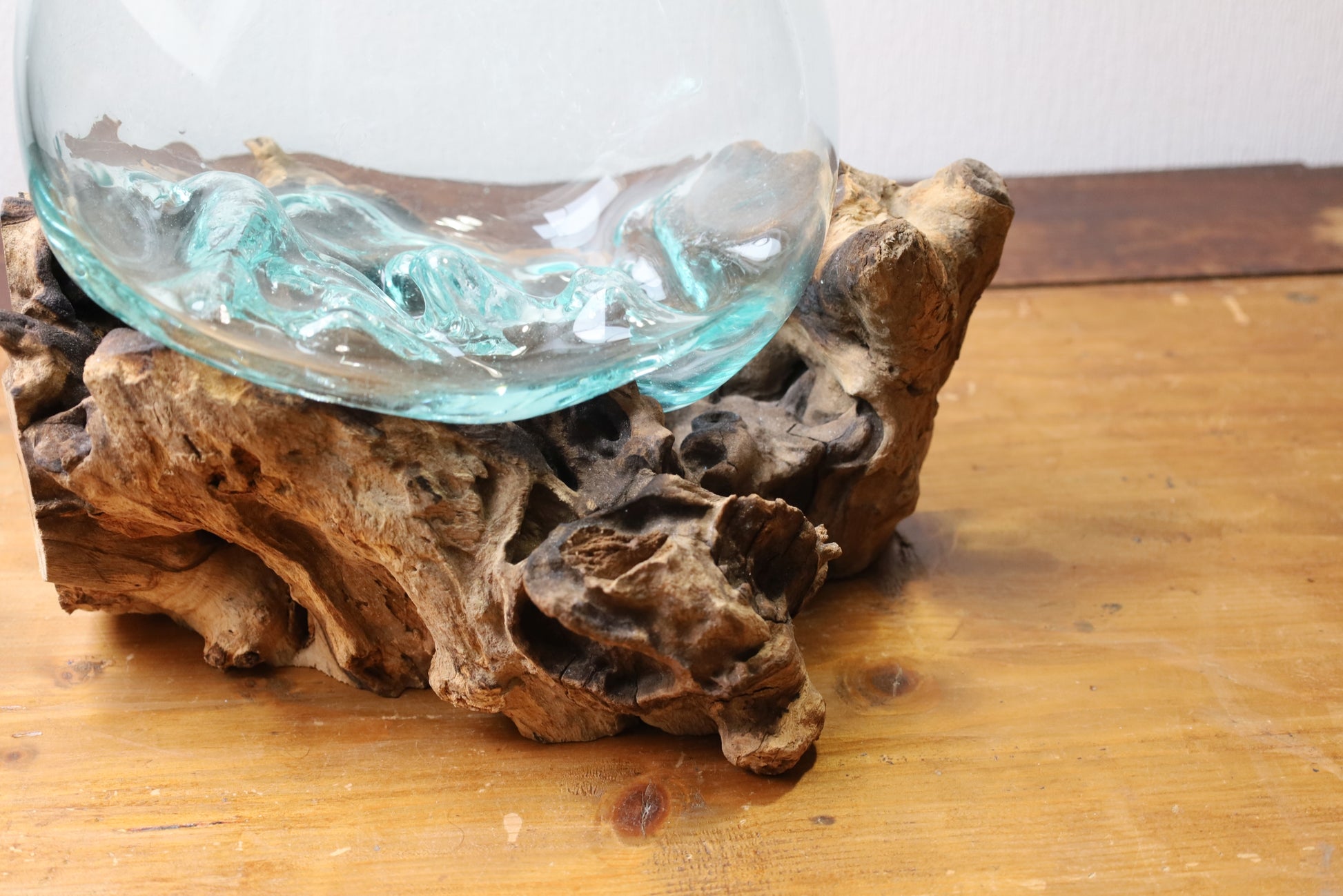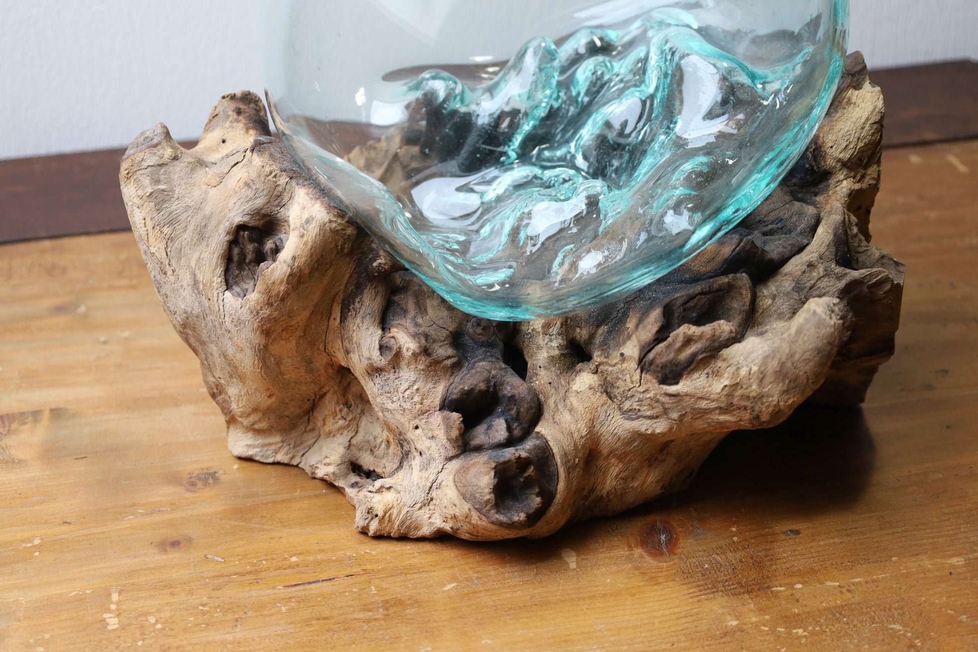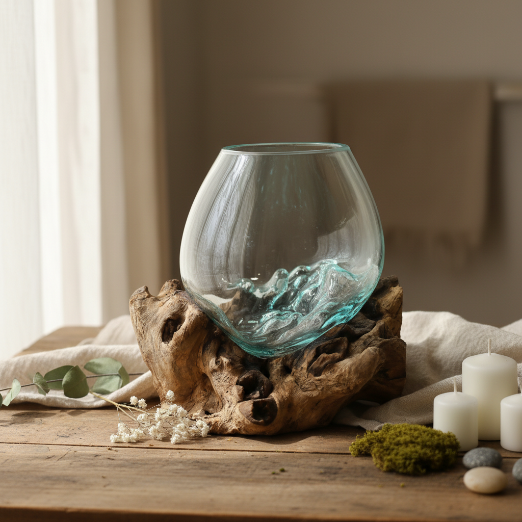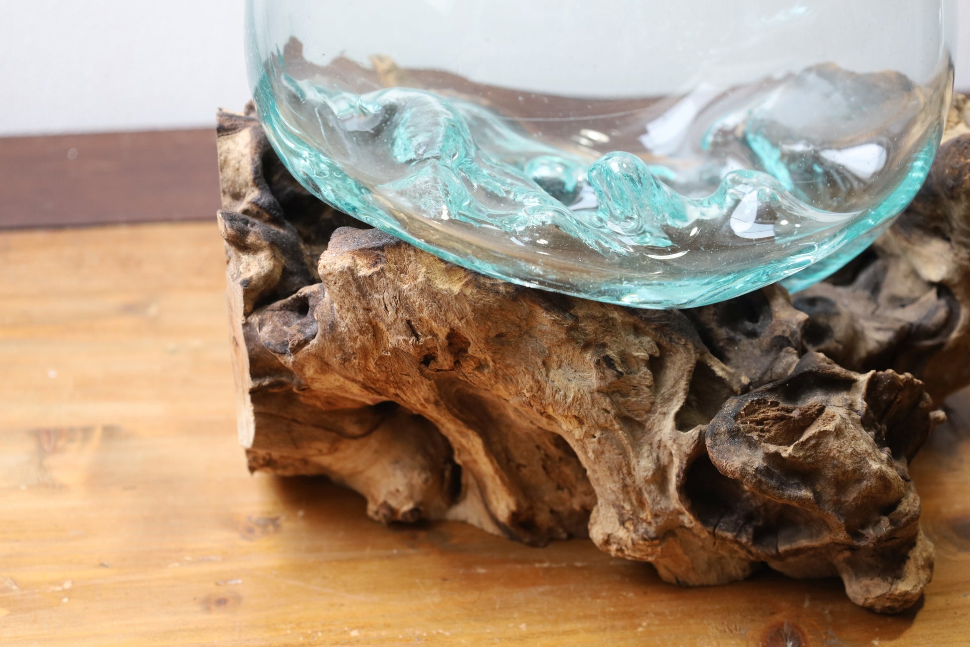 Meisterhaft verarbeitete Glasvase auf gewachsenem Teakwurzelholz – ein Naturwerk mit eigenem Wesen. Kunsthandwerker verschmelzen mundgeblasenes Recycling-Glas im heißen Zustand mit dem stabilen Holzsockel, wobei sich das Glas organisch an jede Wurzelform anpasst. Die dunklen Brandfärbungen entstehen auf natürliche Weise und machen jedes Stück zu einem unverwechselbaren Original. Nachhaltige Materialien und handwerkliche Präzision vereinen sich zu einem zeitlosen Dekorationsstück, das Raum und Sinne bereichert.