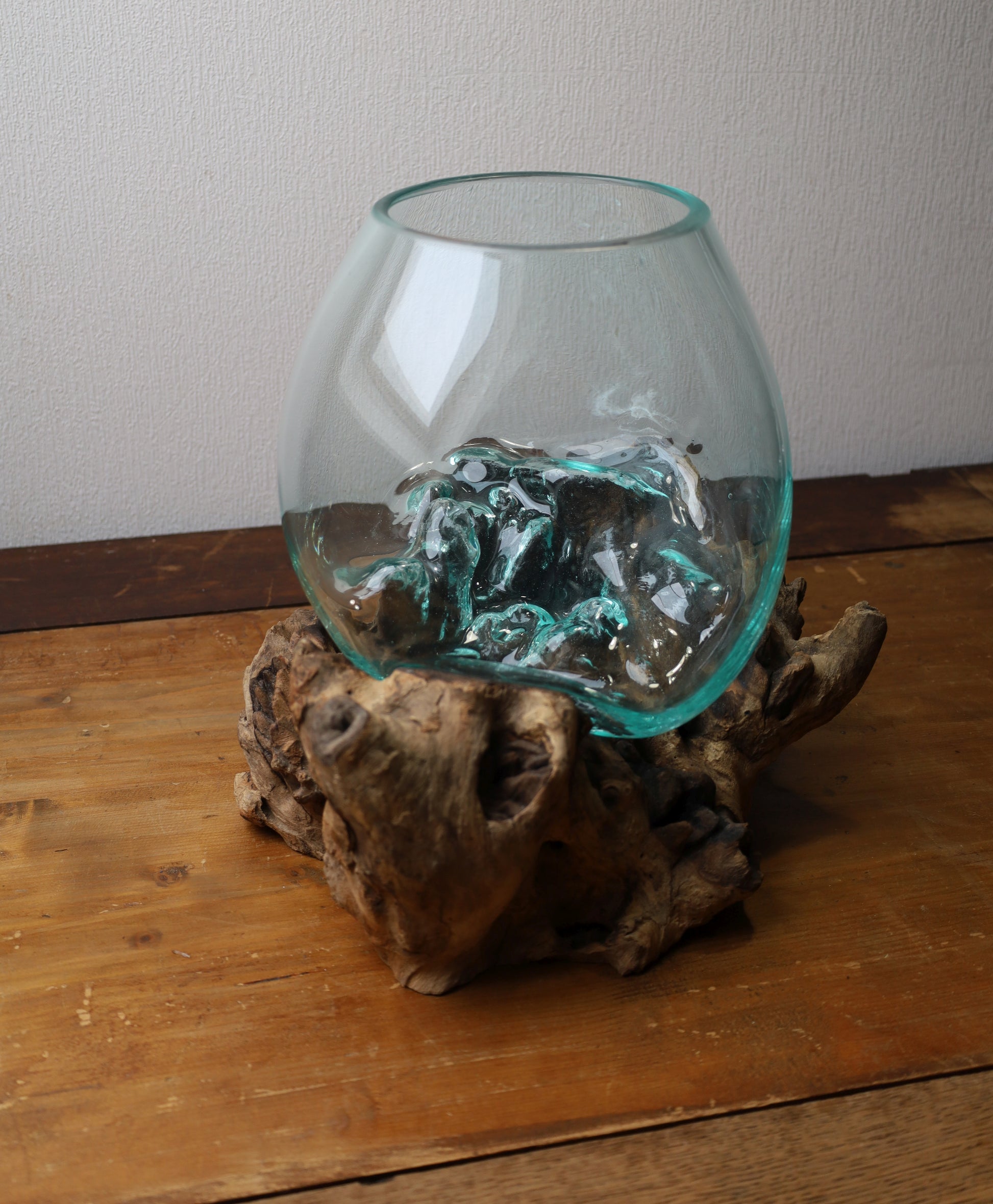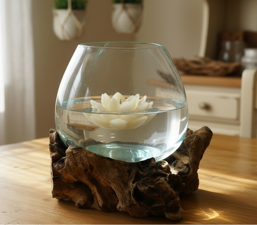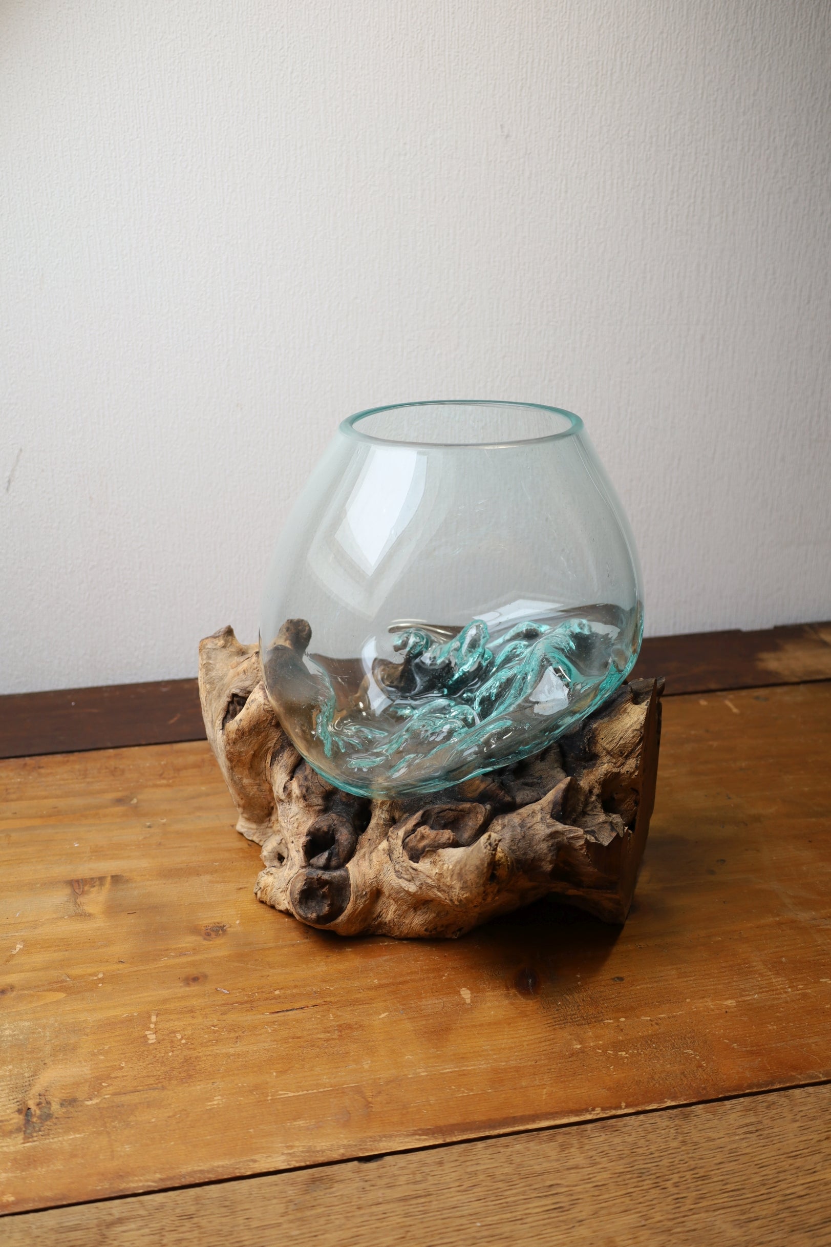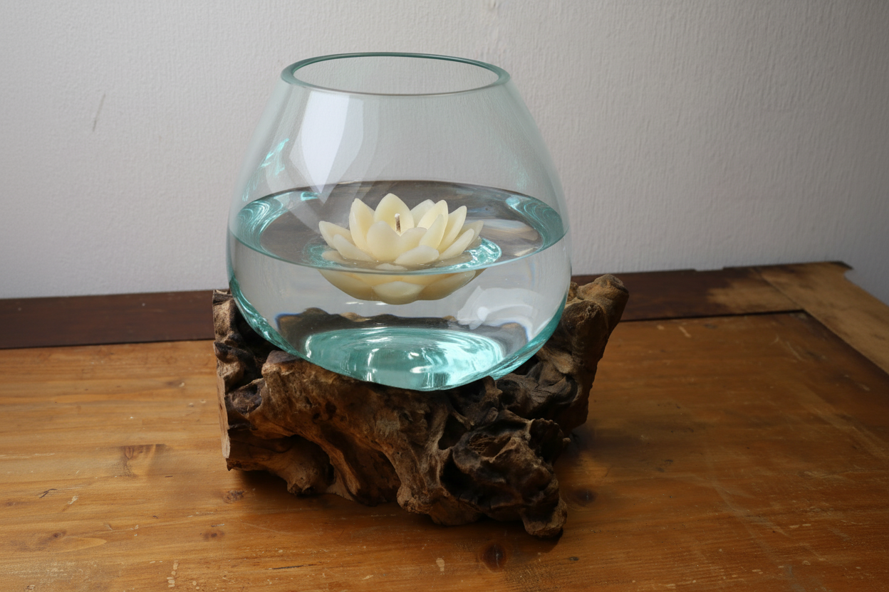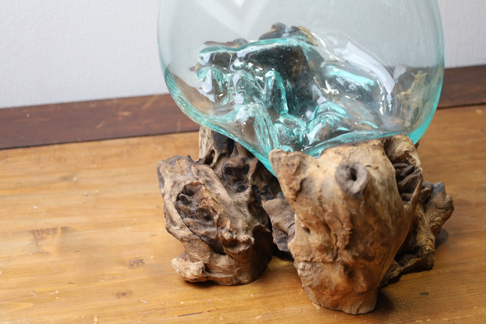 Meisterhaft verarbeitete Glasvase auf gewachsenem Teakwurzelholz – ein Naturwerk mit eigenem Wesen. Kunsthandwerker verschmelzen mundgeblasenes Recycling-Glas im heißen Zustand mit dem stabilen Holzsockel, wobei sich das Glas organisch an jede Wurzelform anpasst. Die dunklen Brandfärbungen entstehen auf natürliche Weise und machen jedes Stück zu einem unverwechselbaren Original. Nachhaltige Materialien und handwerkliche Präzision vereinen sich zu einem zeitlosen Dekorationsstück, das Raum und Sinne bereichert.