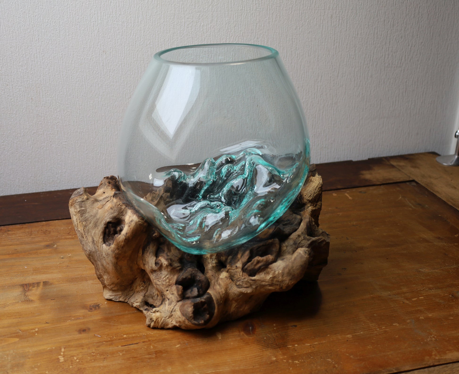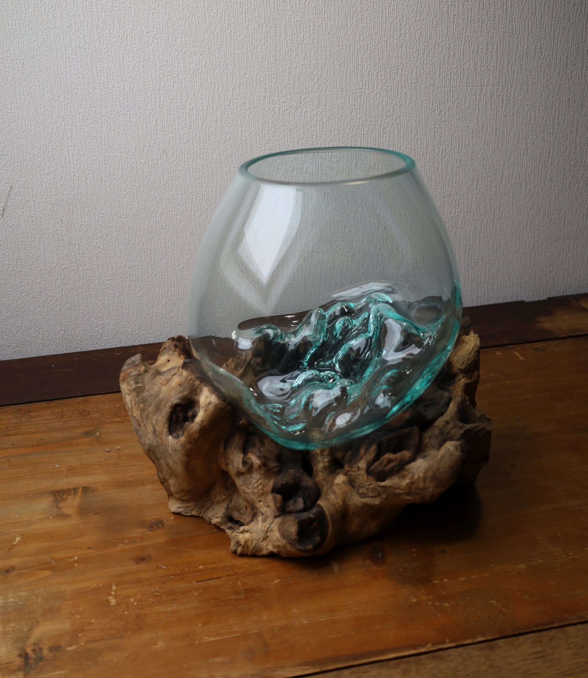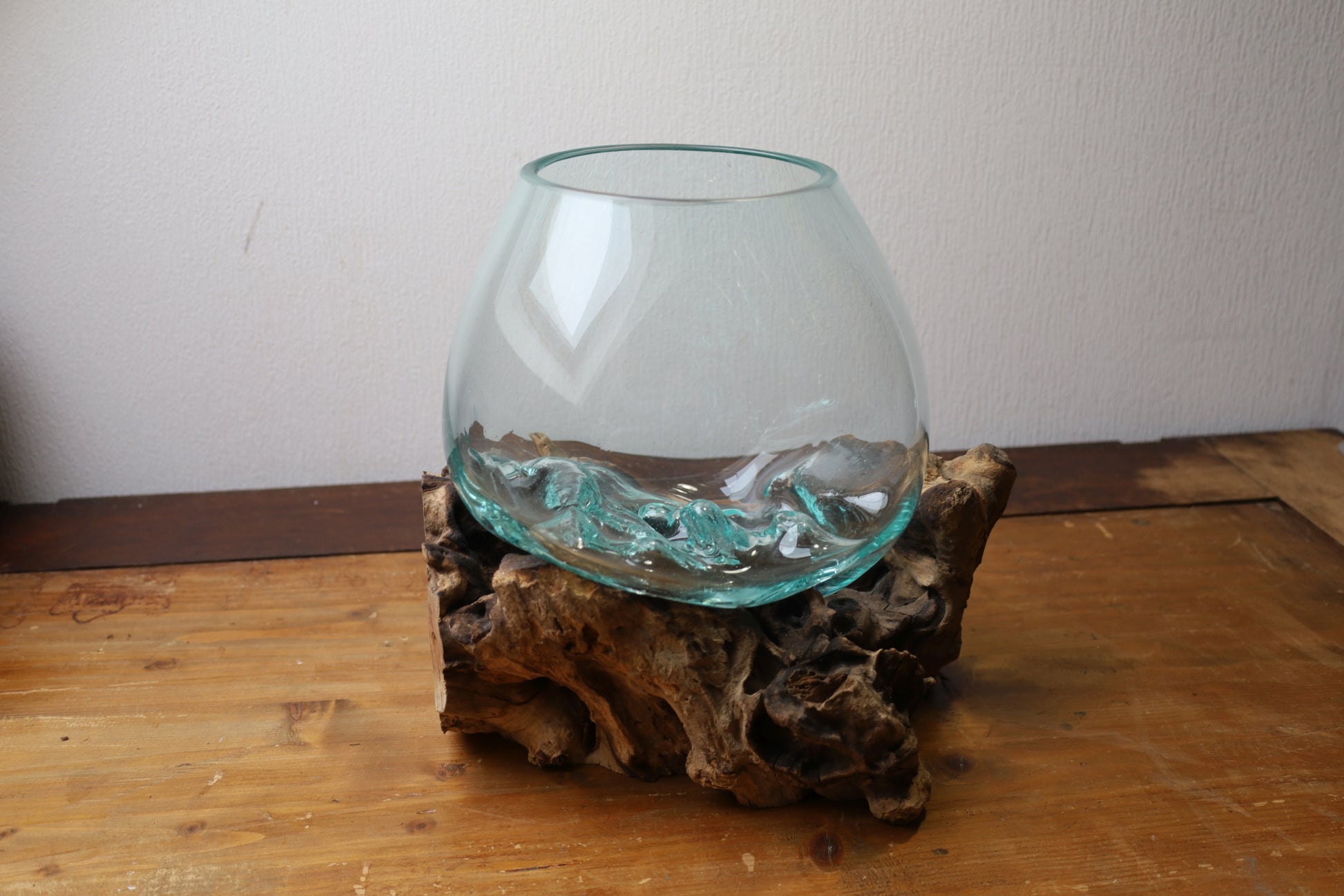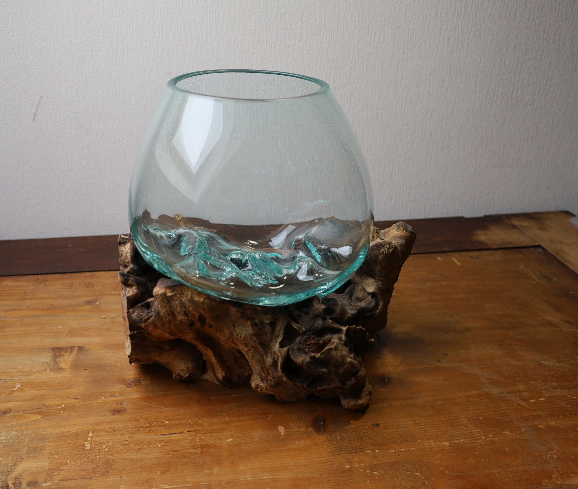 Meisterhaft verarbeitete Glasvase auf gewachsenem Teakwurzelholz – ein Naturwerk mit eigenem Wesen. Kunsthandwerker verschmelzen mundgeblasenes Recycling-Glas im heißen Zustand mit dem stabilen Holzsockel, wobei sich das Glas organisch an jede Wurzelform anpasst. Die dunklen Brandfärbungen entstehen auf natürliche Weise und machen jedes Stück zu einem unverwechselbaren Original. Nachhaltige Materialien und handwerkliche Präzision vereinen sich zu einem zeitlosen Dekorationsstück, das Raum und Sinne bereichert.