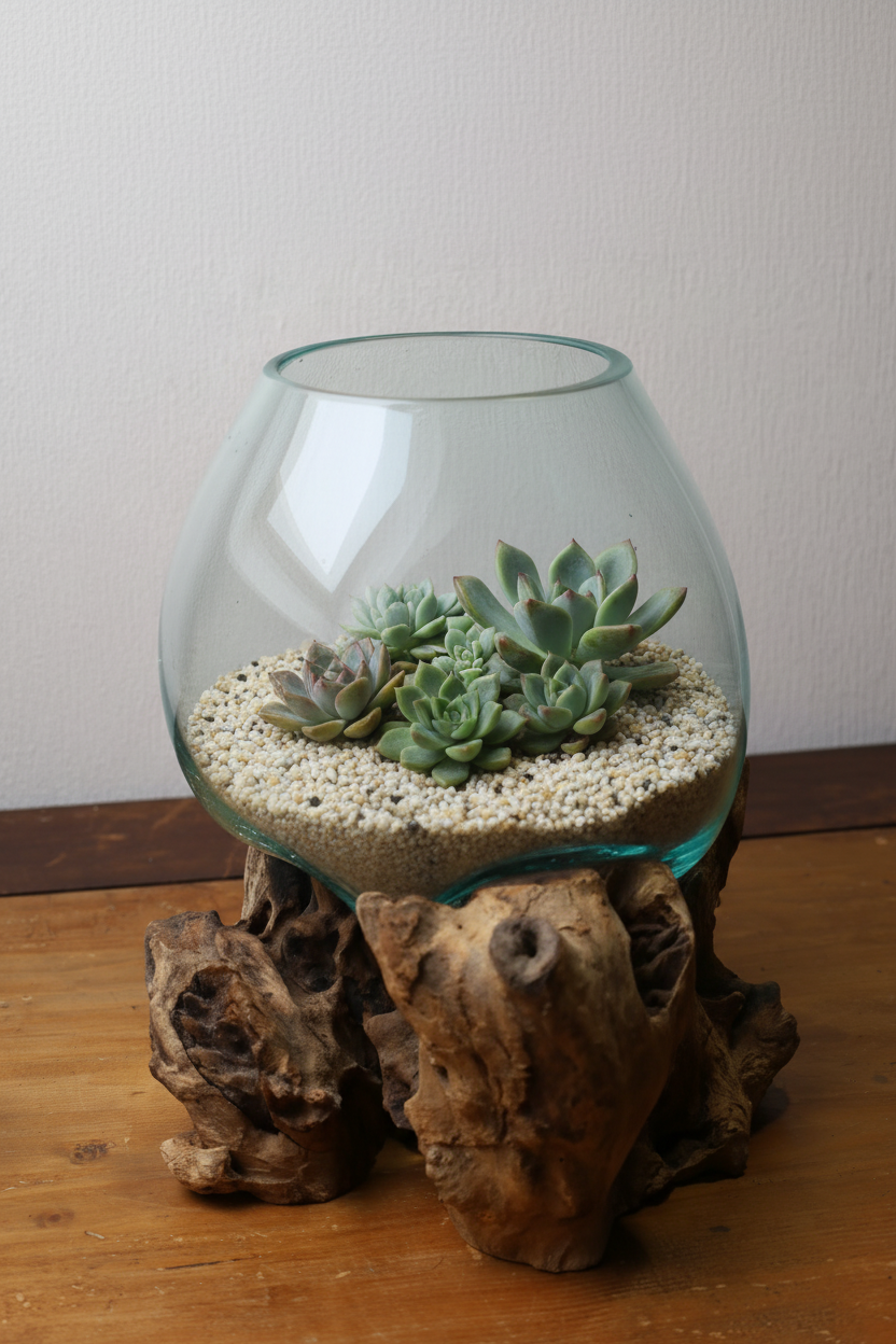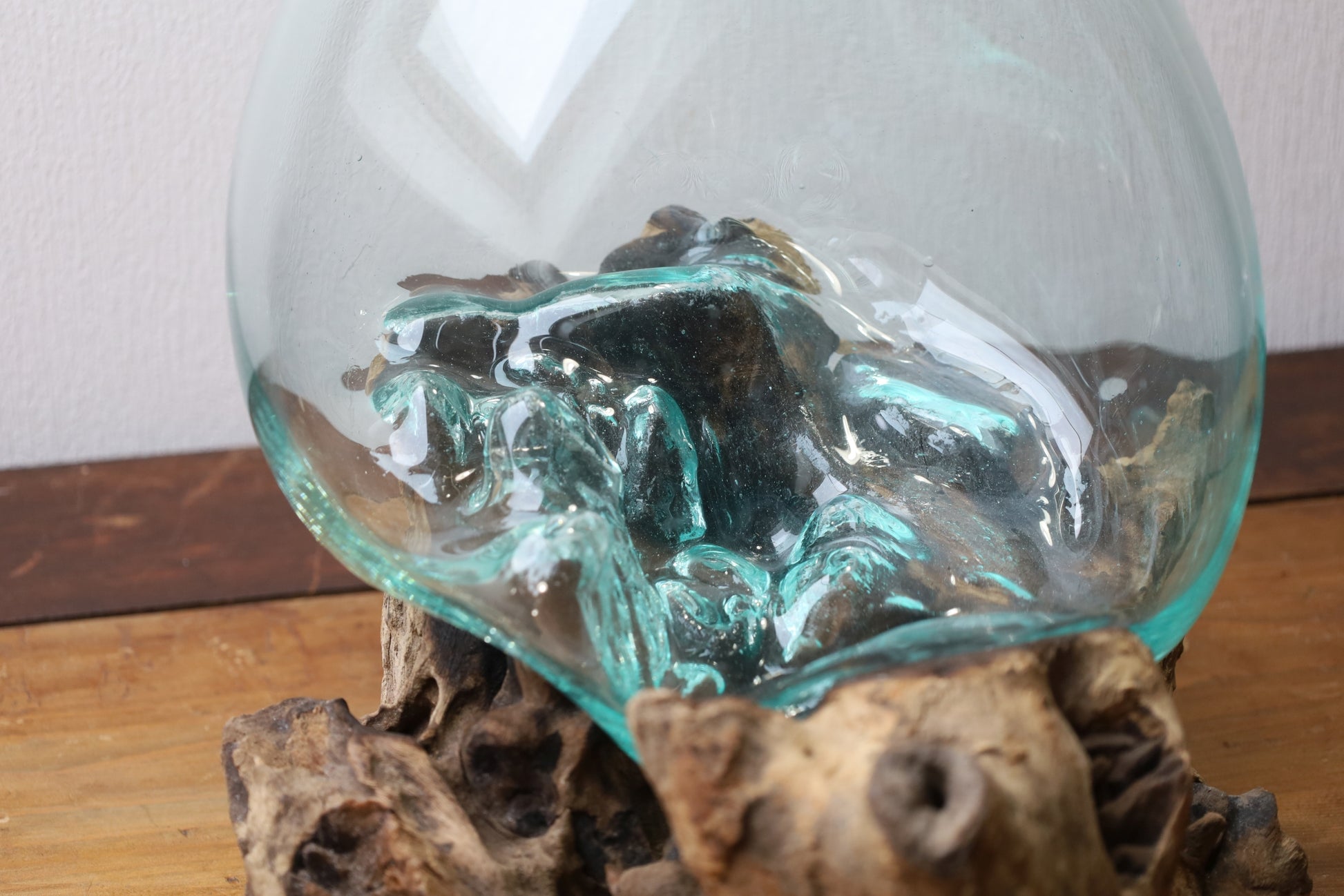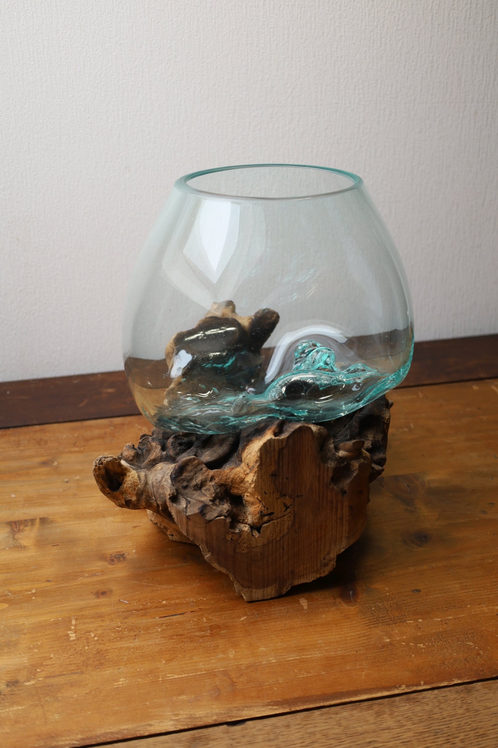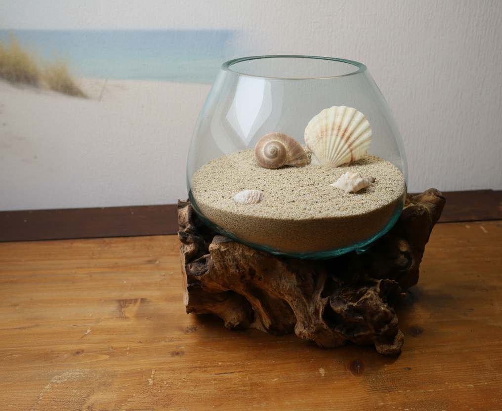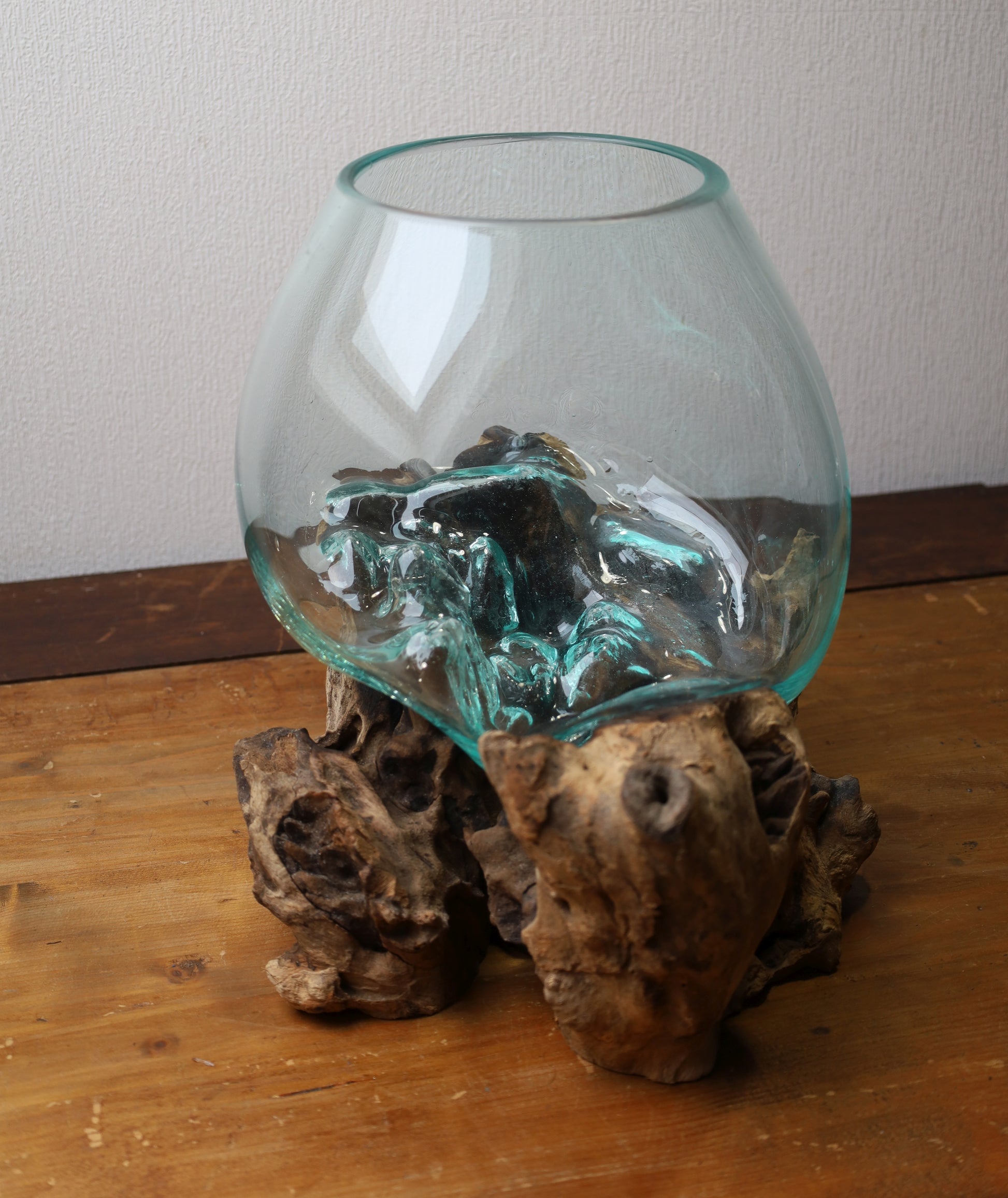 Meisterhaft verarbeitete Glasvase auf gewachsenem Teakwurzelholz – ein Naturwerk mit eigenem Wesen. Kunsthandwerker verschmelzen mundgeblasenes Recycling-Glas im heißen Zustand mit dem stabilen Holzsockel, wobei sich das Glas organisch an jede Wurzelform anpasst. Die dunklen Brandfärbungen entstehen auf natürliche Weise und machen jedes Stück zu einem unverwechselbaren Original. Nachhaltige Materialien und handwerkliche Präzision vereinen sich zu einem zeitlosen Dekorationsstück, das Raum und Sinne bereichert.