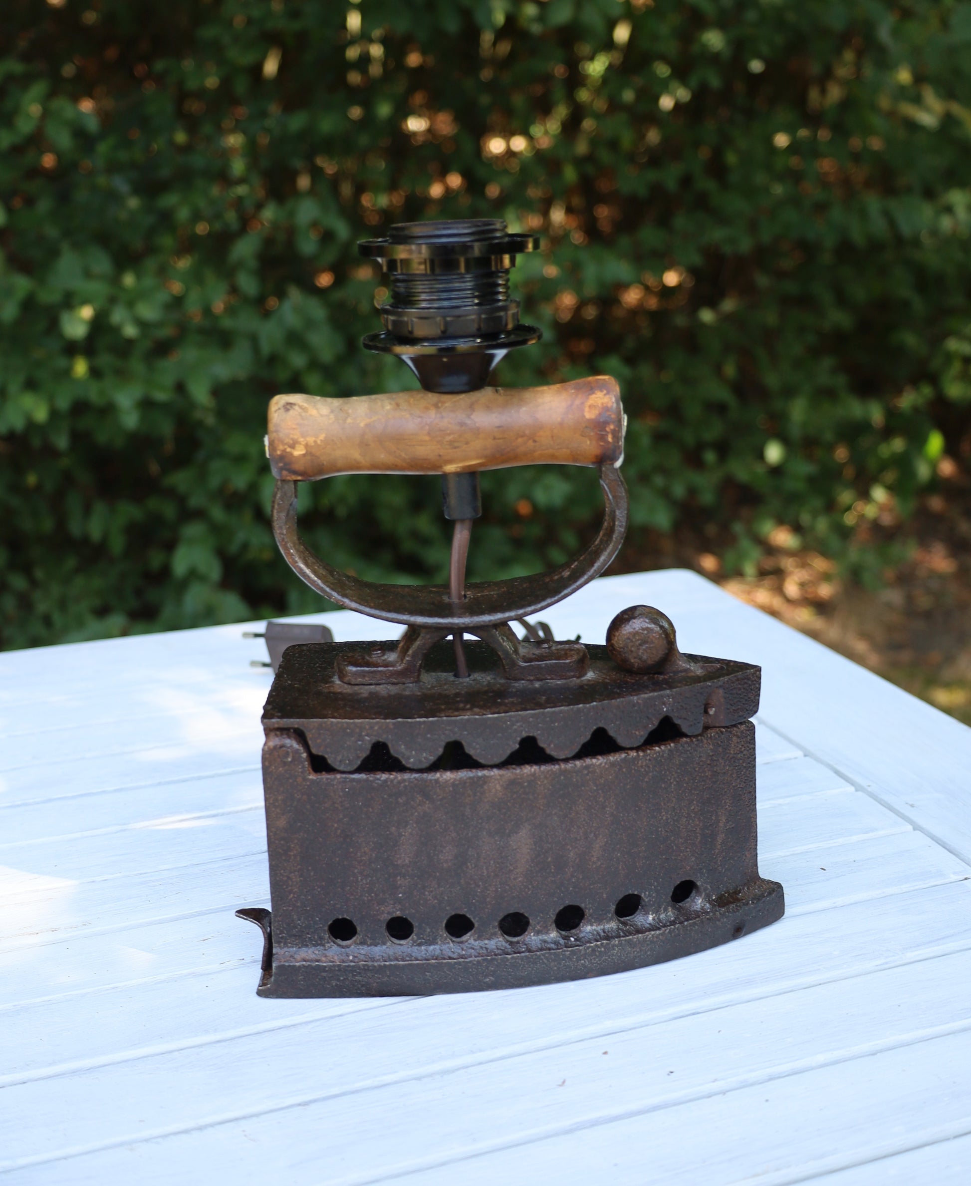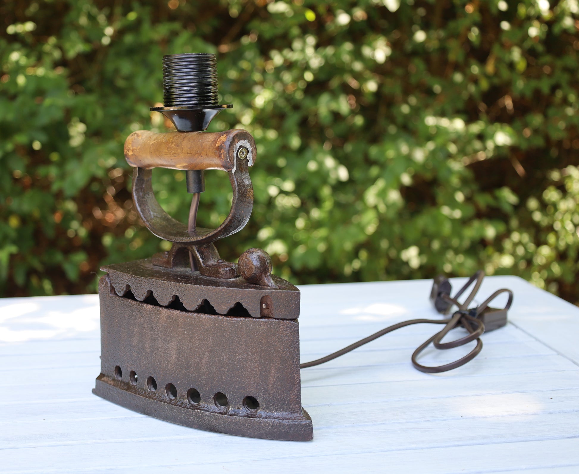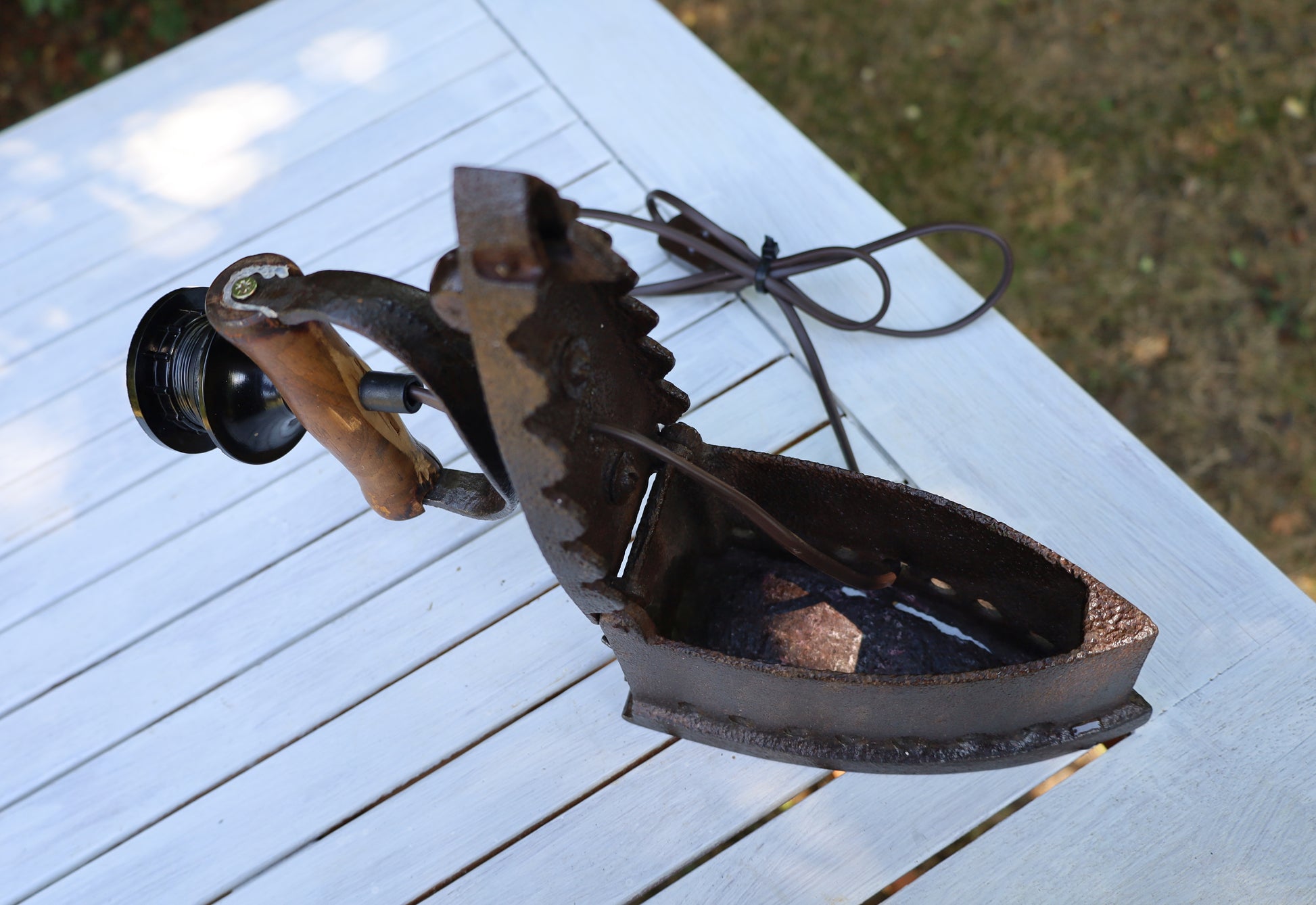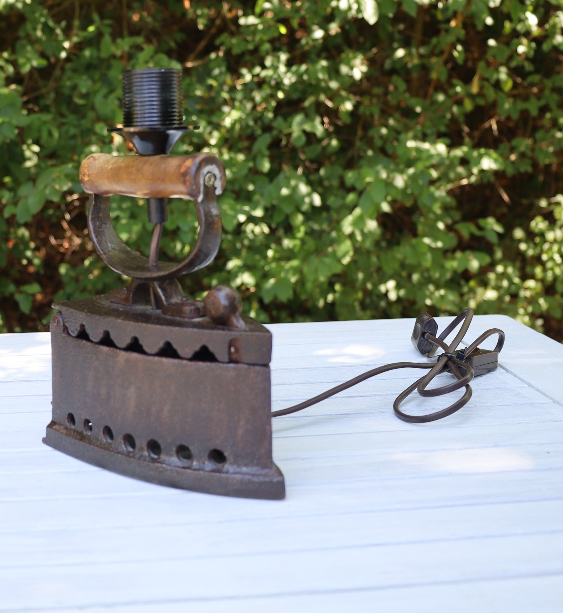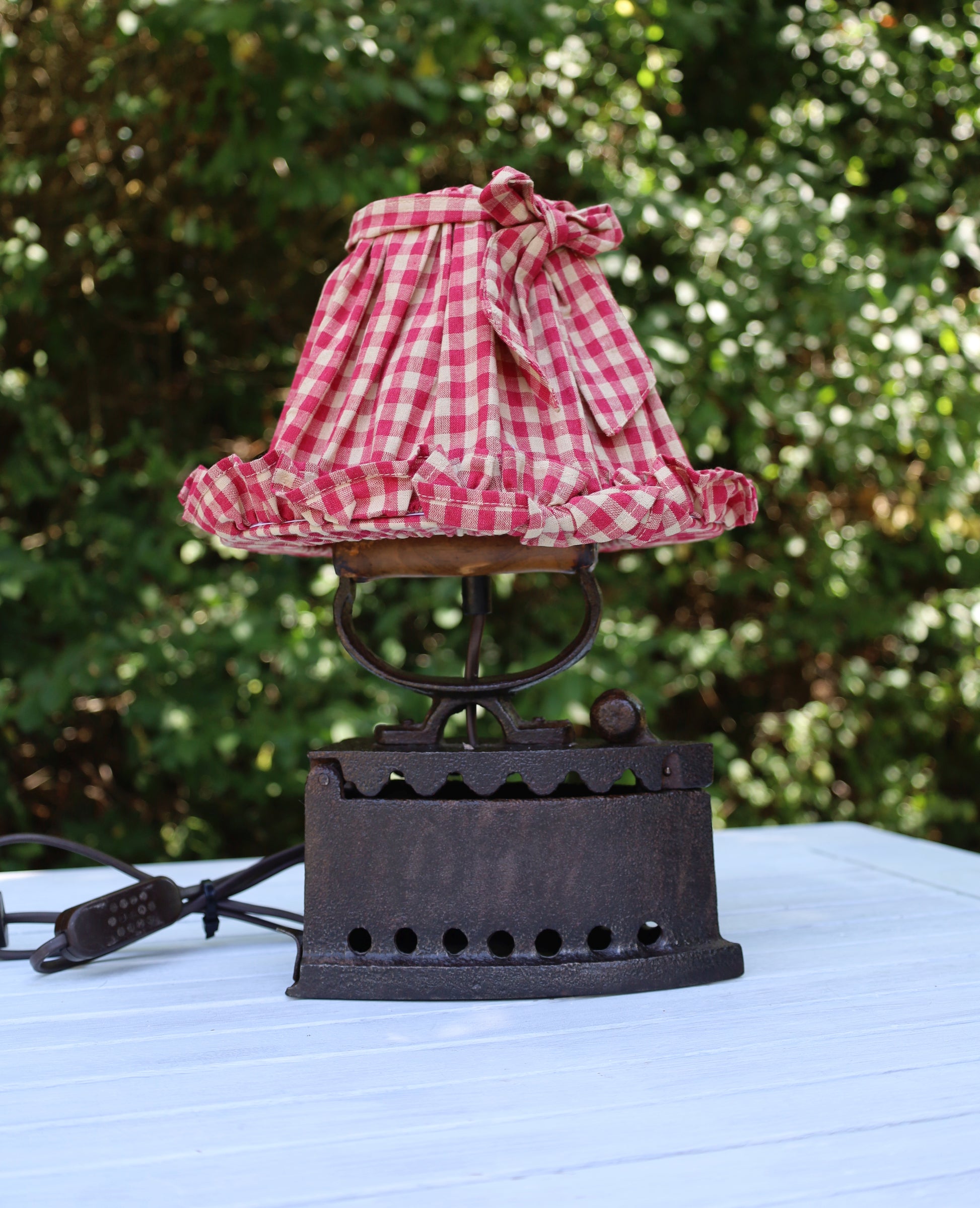 Tischleuchte aus altem Bügeleisen mit rotkariertem Lampenschirm