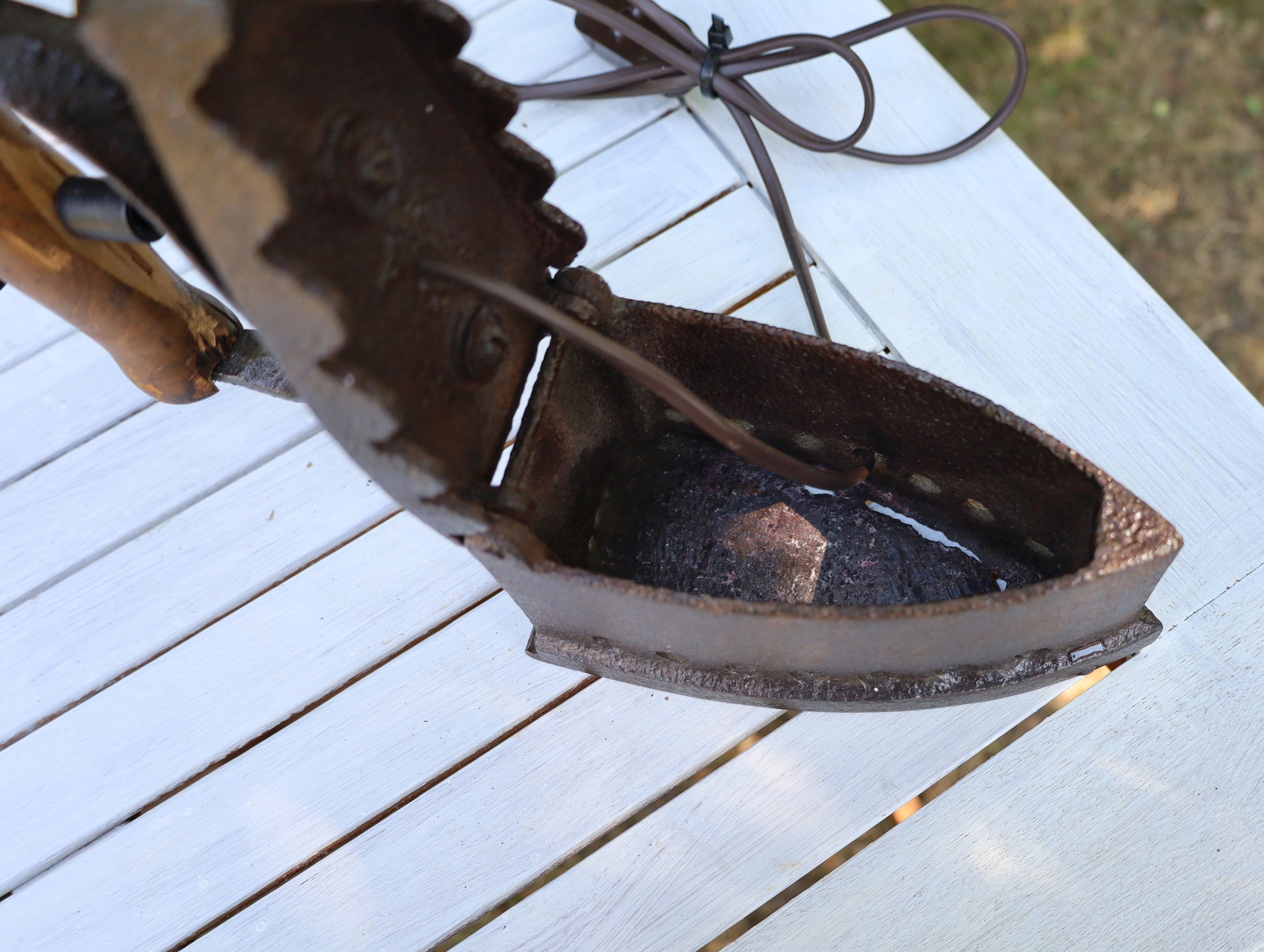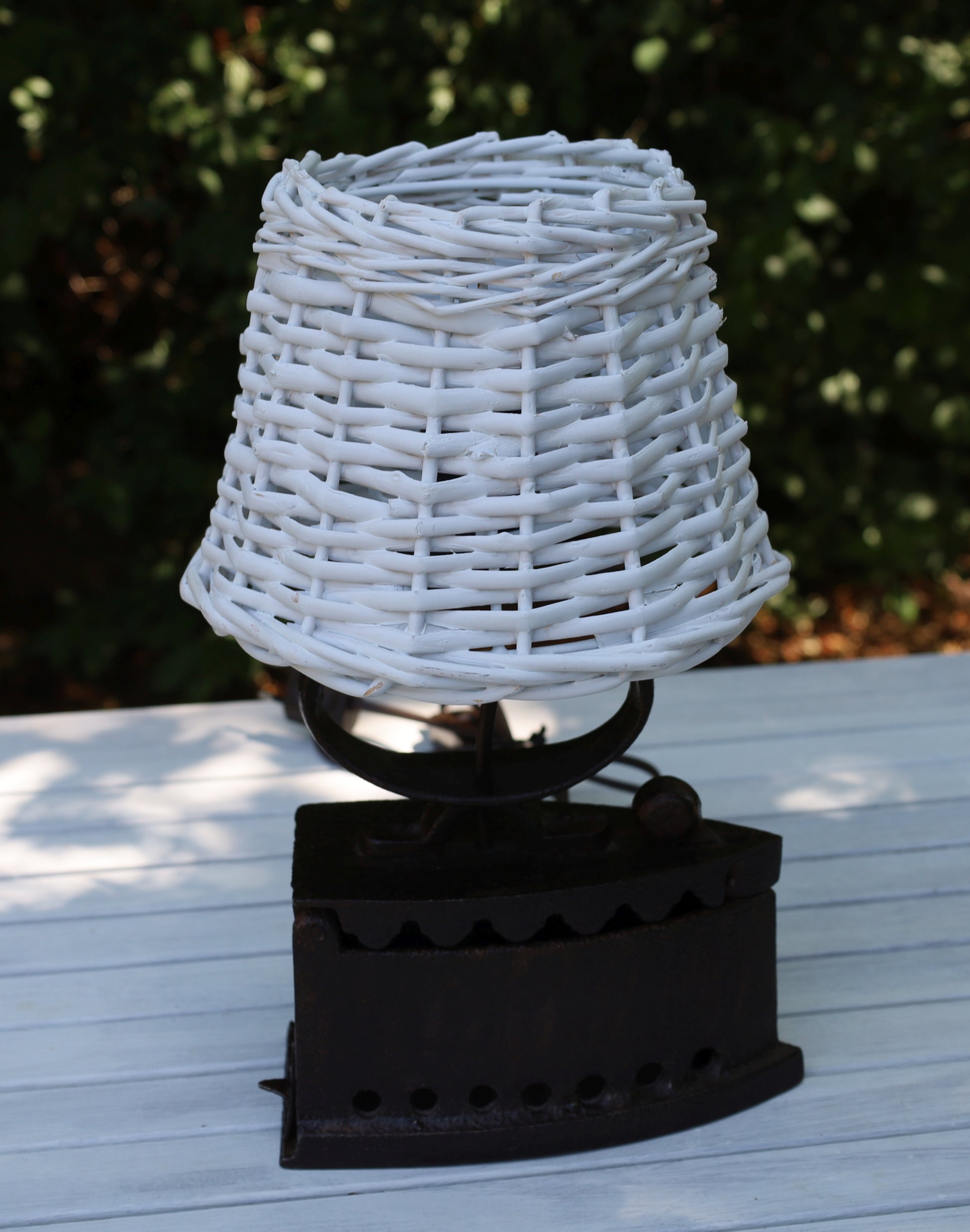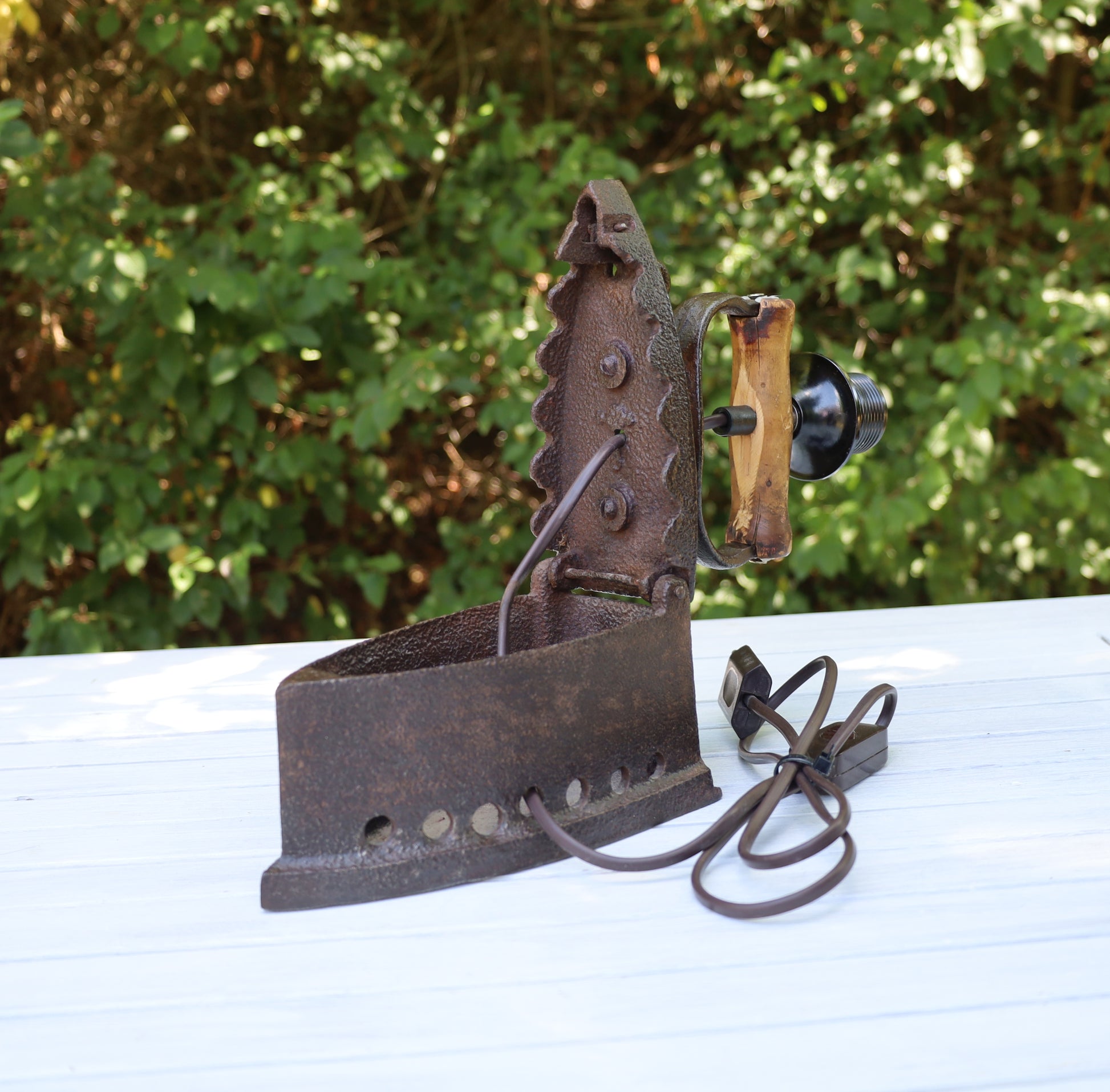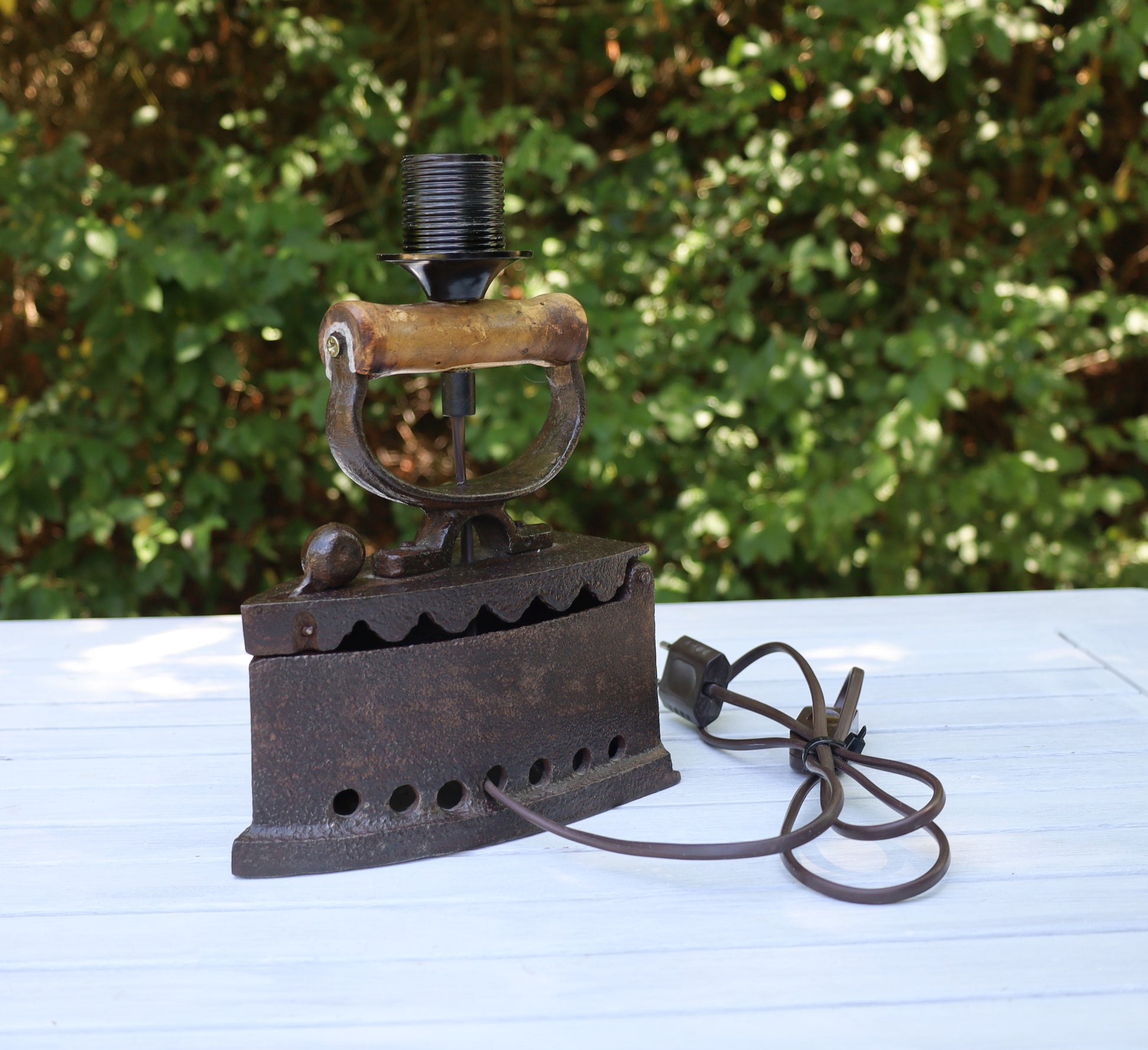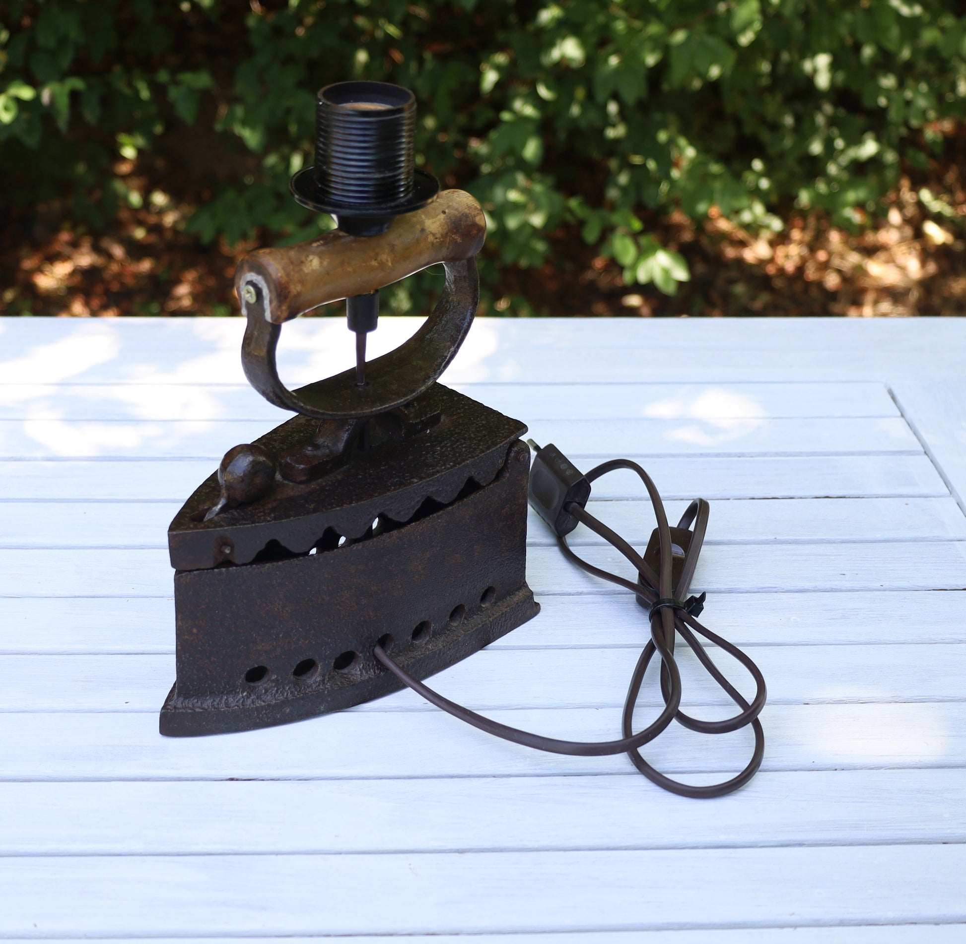 Tischleuchte aus altem Bügeleisen mit rotkariertem Lampenschirm