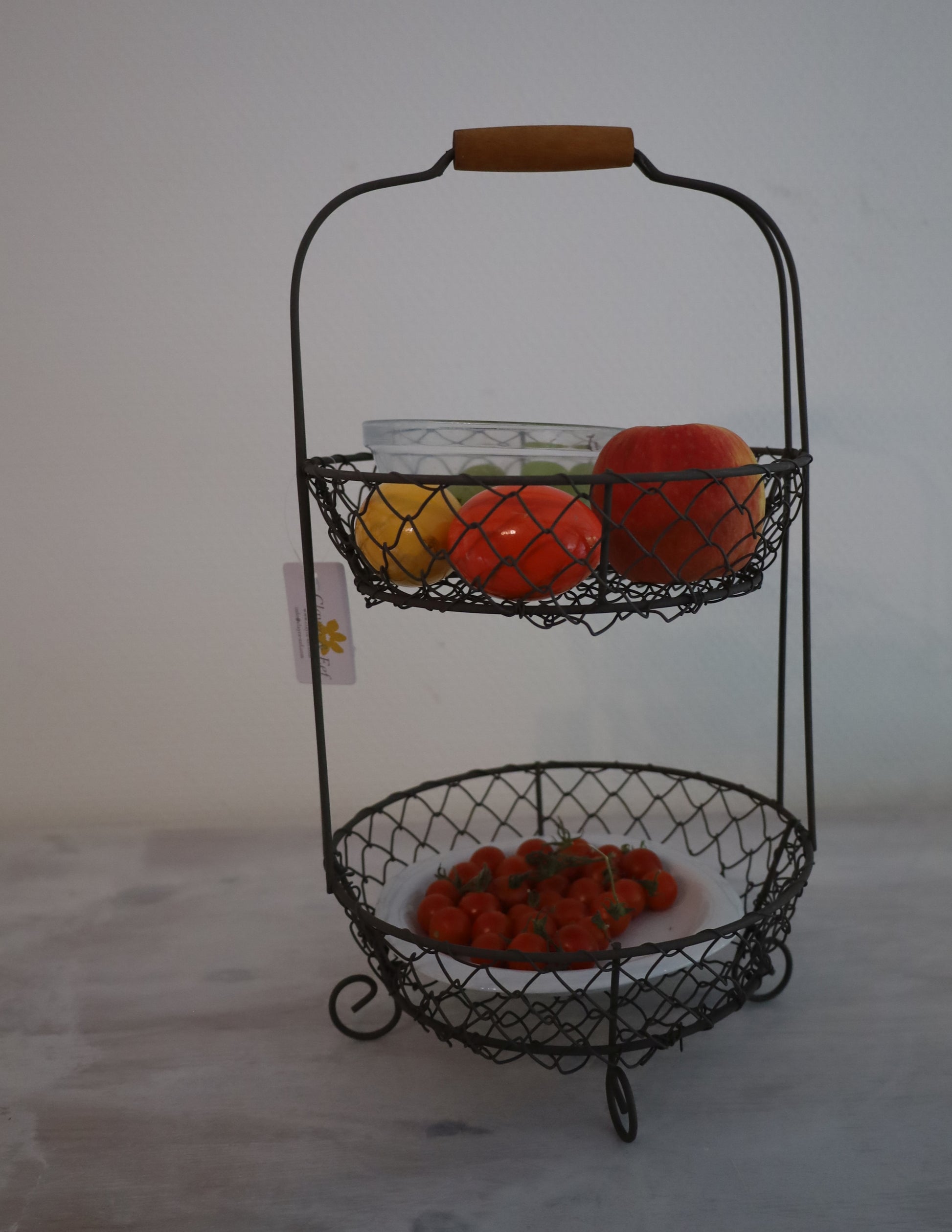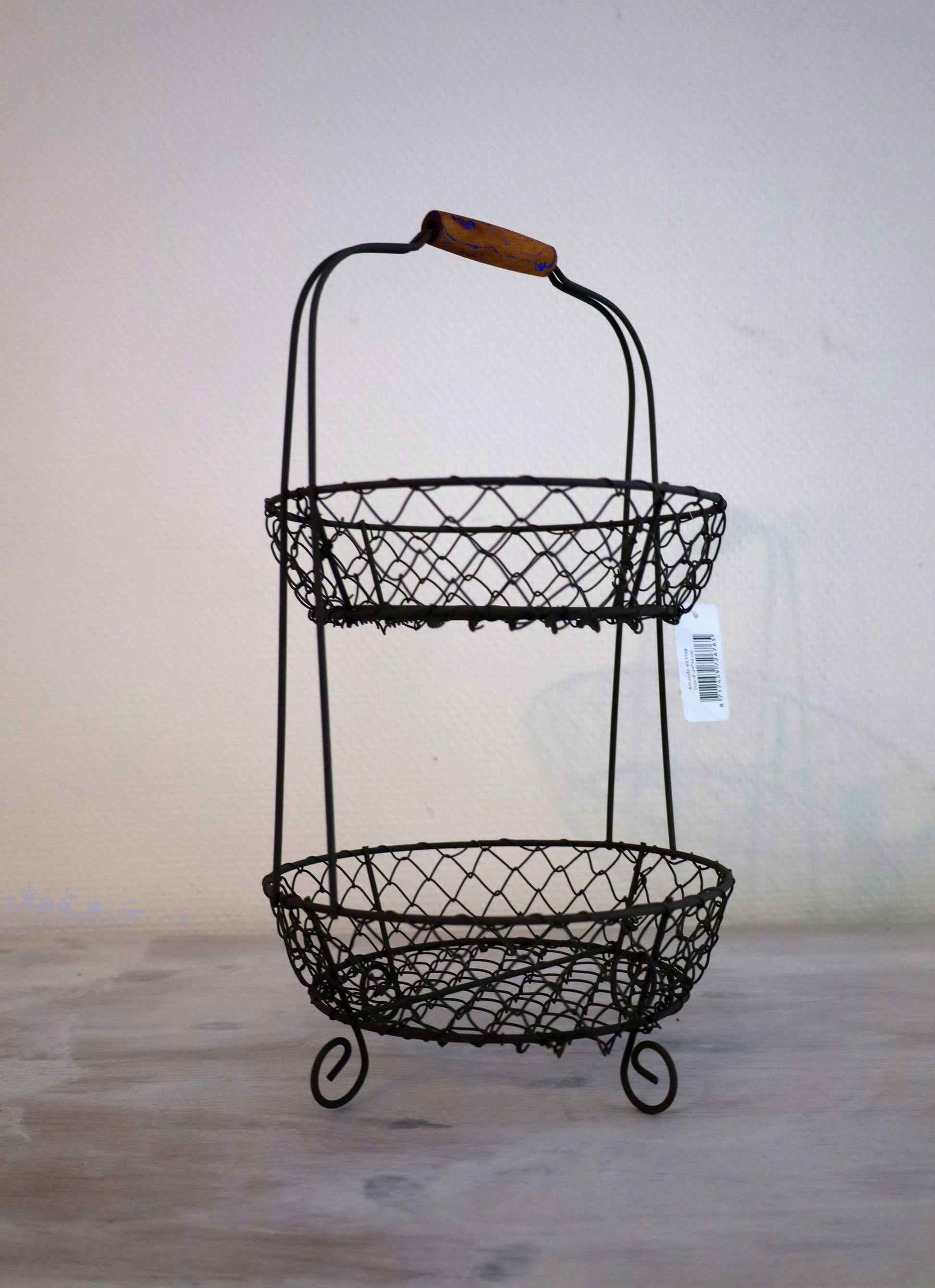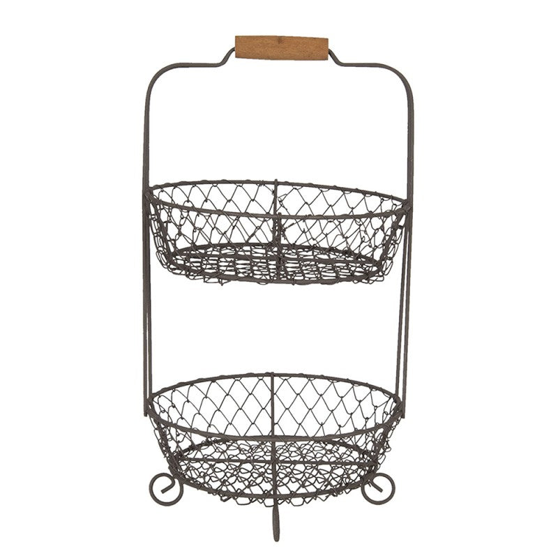 Kompakte Etagere mit zwei geräumigen Draht-Körben – die perfekte Lösung für die Obst- und Gemüselagerung. Das offene Design ermöglicht schnellen Zugriff und gute Belüftung. Das stabile Metallgestell passt unauffällig in jede Küche und lässt sich leicht reinigen. Platzsparend und funktional für Arbeitsplatte oder Speisekammer.