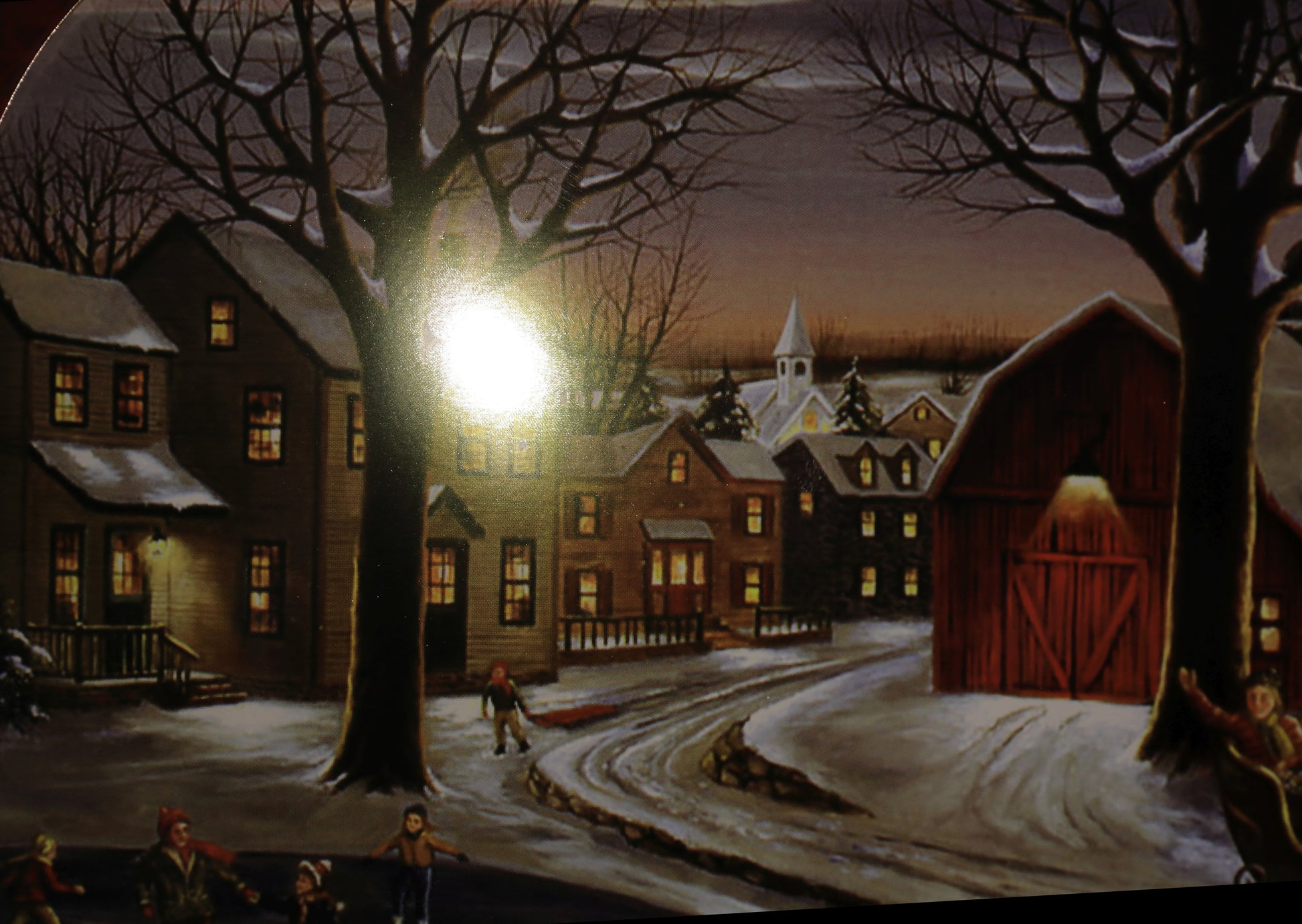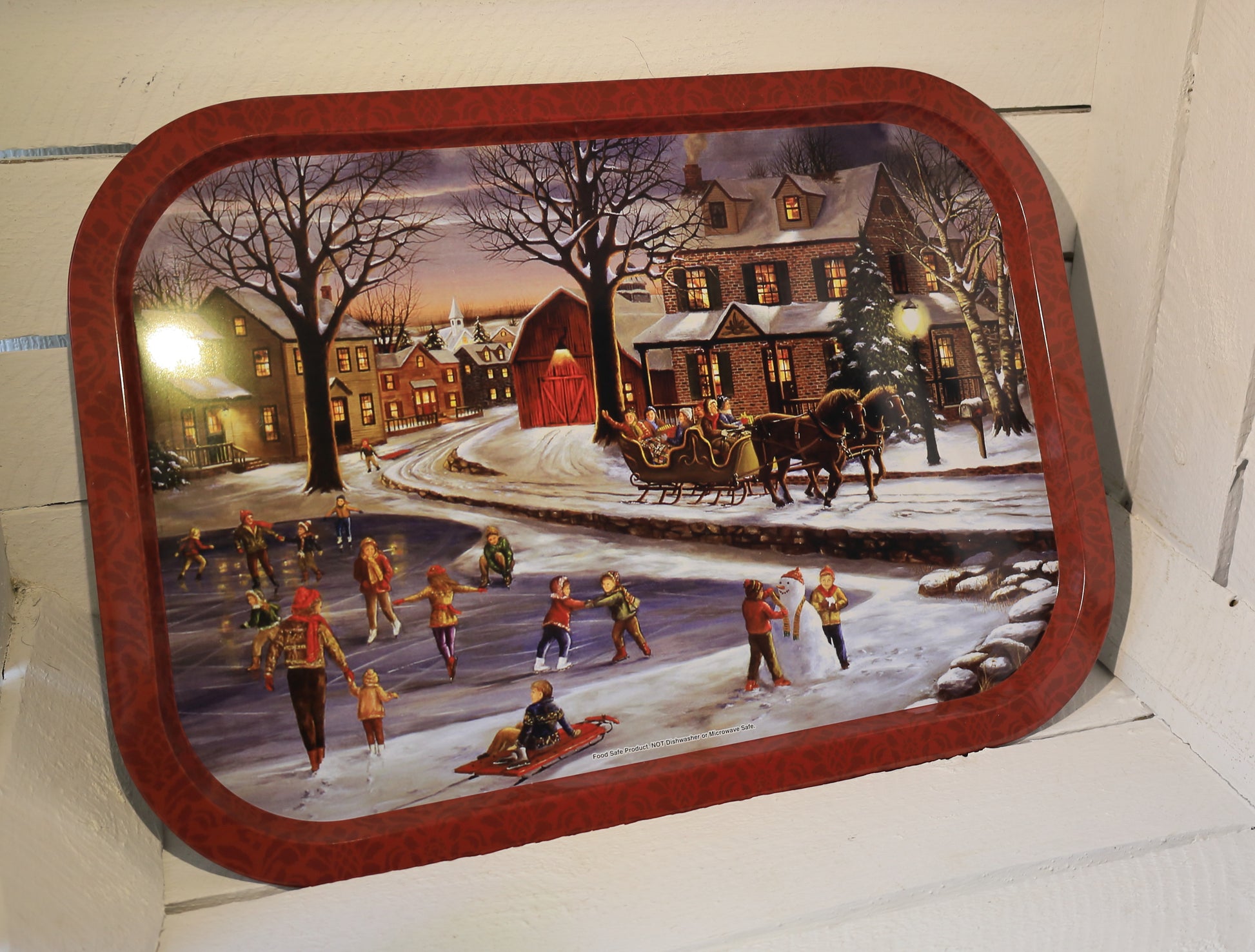 Tablett aus Metall mit winterlicher Dorfidylle, Weihnachtsdekoration