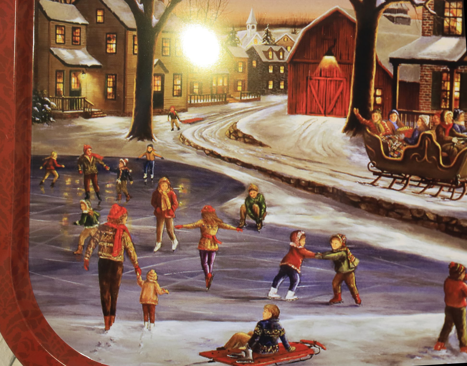 Dieses handliche Metalltablett zeigt eine zauberhafte winterliche Dorfidylle, die mit festlicher Weihnachtsdekoration zum Träumen einlädt. Das liebevoll gestaltete Motiv mit einem zugefrorenen See, Schlittschuhläufern und einer gemütlichen Kutsche schafft eine romantische Atmosphäre, perfekt für besinnliche Stunden. Ideal, um saisonale Köstlichkeiten stilvoll zu servieren und winterliche Momente besonders zu machen.