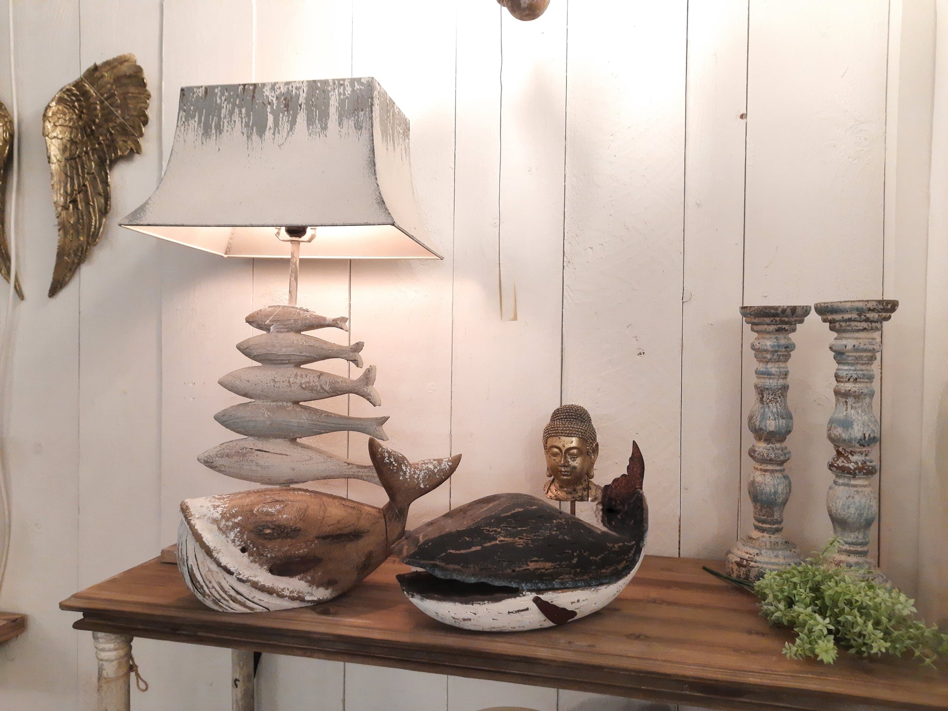 Holzfigur eines Wals mit einem Vintage-Look. Da der Wal aus Naturholz gefertigt ist, ist jedes Stück in den Farbtönen einzigartig. Perfekt für Interieurs im maritimen Stil und zum Kombinieren mit anderen Gegenständen aus der maritimen Kollektion.