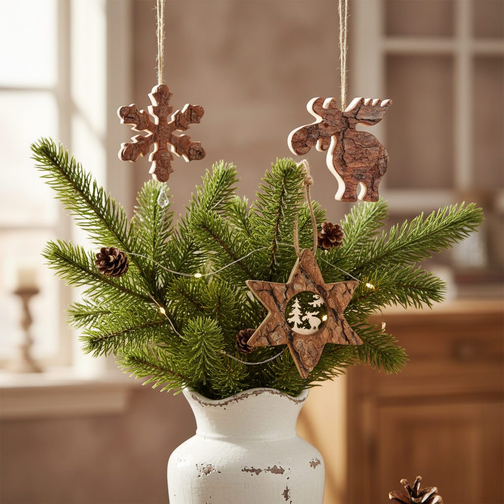 Lassen Sie sich von diesen bezaubernden Anhängern aus echtem Rindenholz in die winterliche Jahreszeit entführen. Gefertigt aus Materialien verschiedener Laubbäume, verkörpern sie die natürliche Schönheit der kalten Monate. Die kunstvoll gestalteten Schneeflocken-Designs verleihen Ihrer Dekoration einen frostigen, märchenhaften Charakter. Perfekt für rustikale Landhausstile und festliche Tafeln – diese Anhänger schaffen eine gemütliche, winterliche Atmosphäre in jedem Raum. Ob am Weihnachtsbaum, an Fenstern oder als Tischdeko: Sie bringen die Magie des Winters direkt zu Ihnen nach Hause. Jedes Stück ist ein natürliches Unikat mit eigenem Charakter.